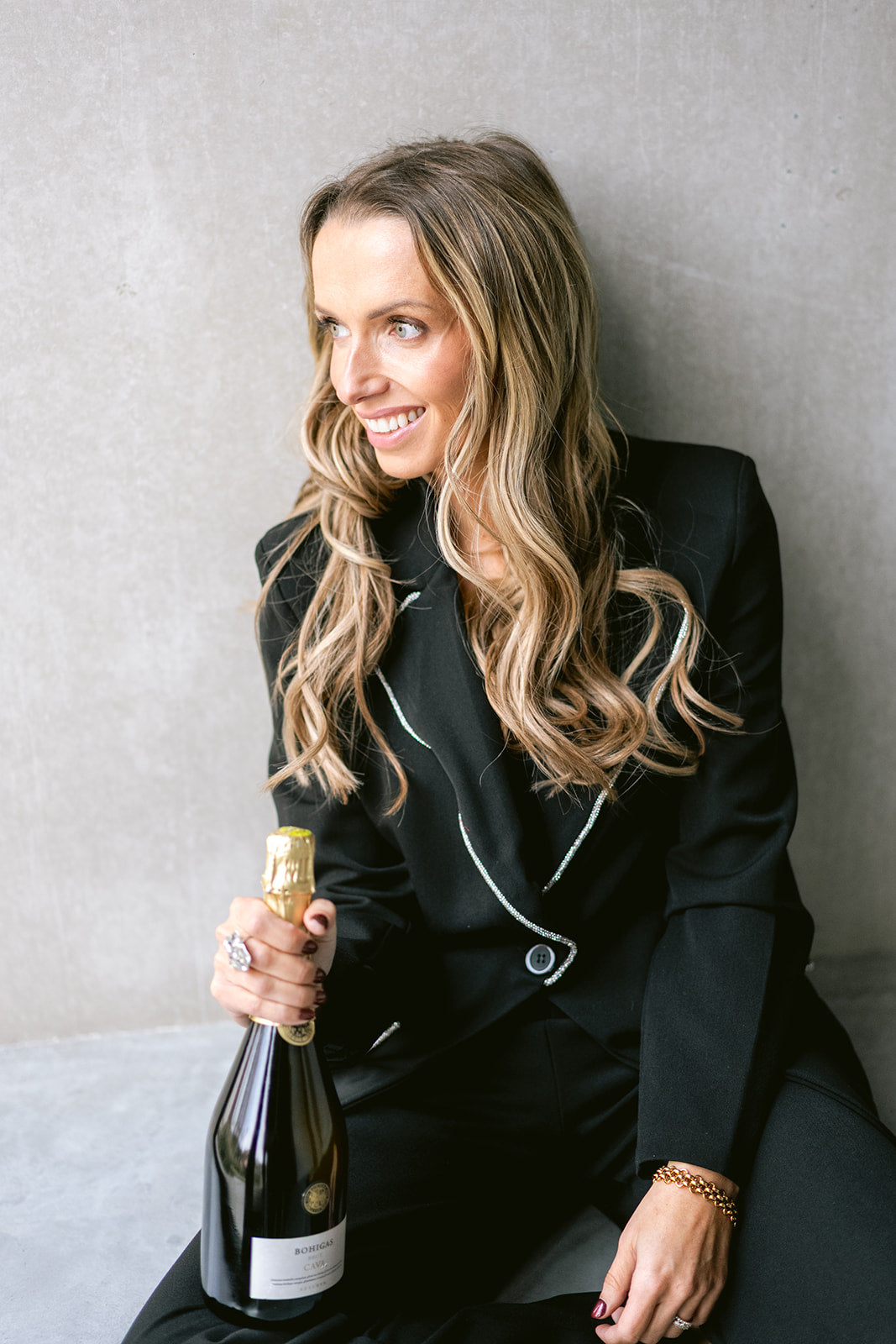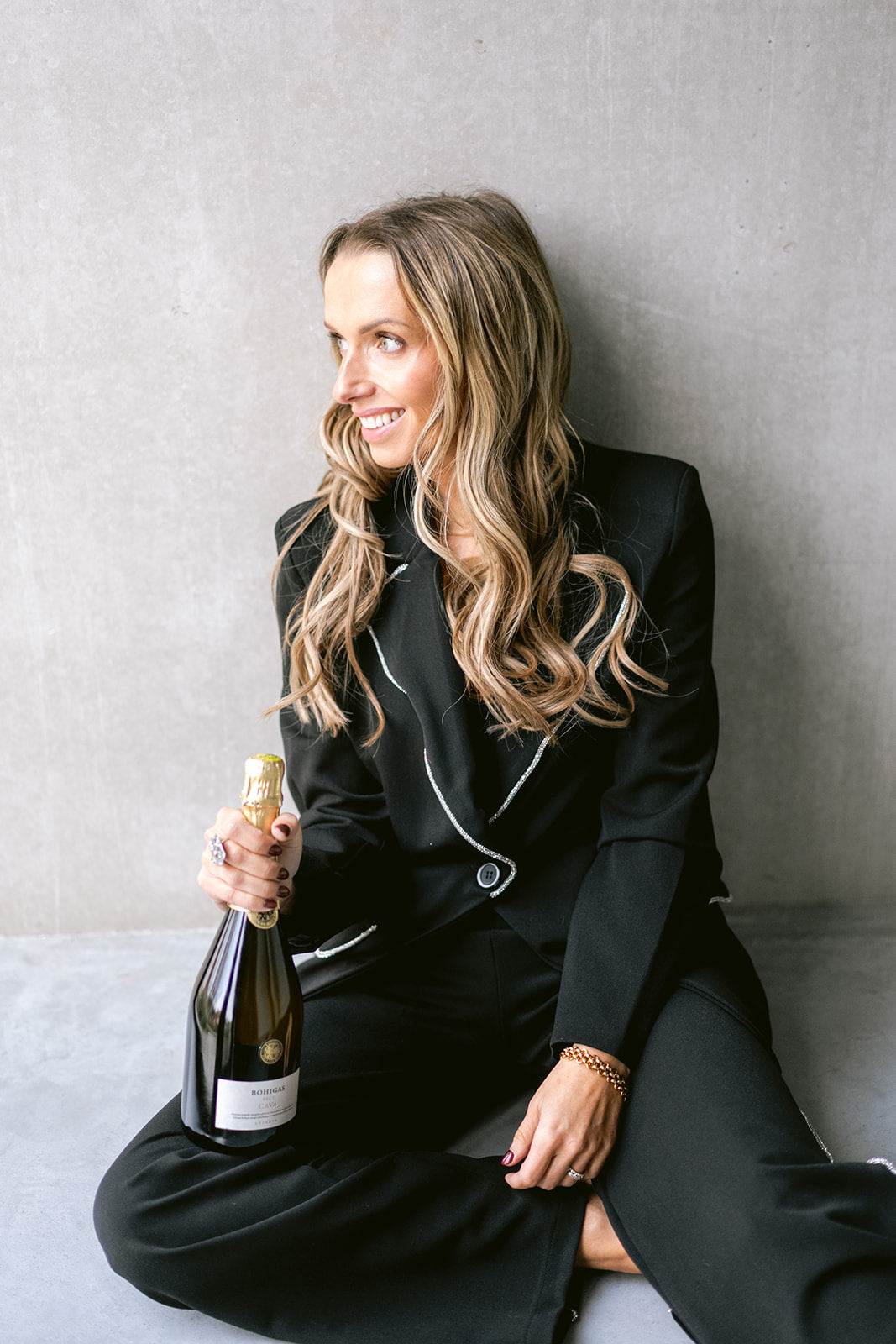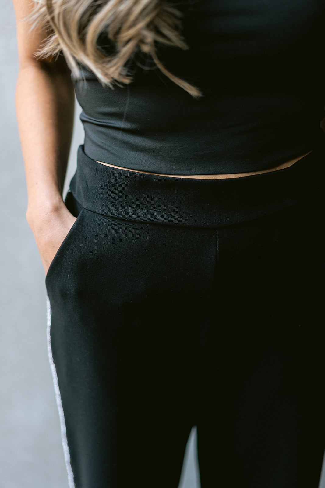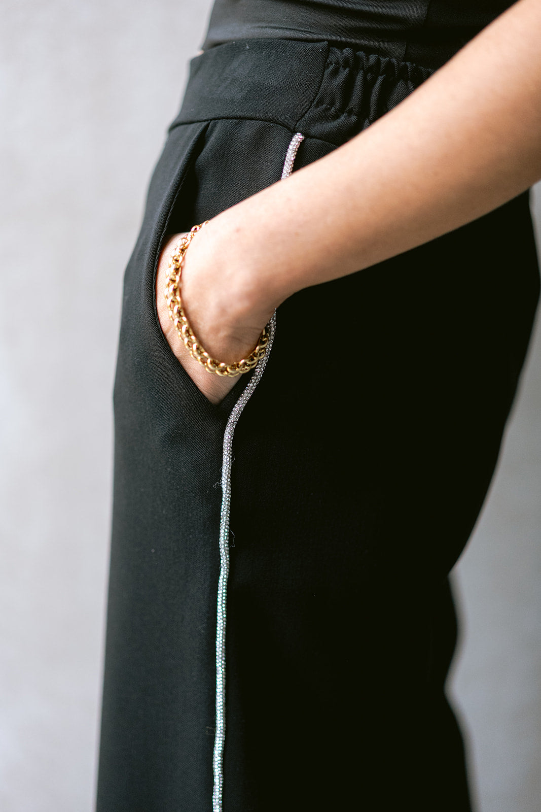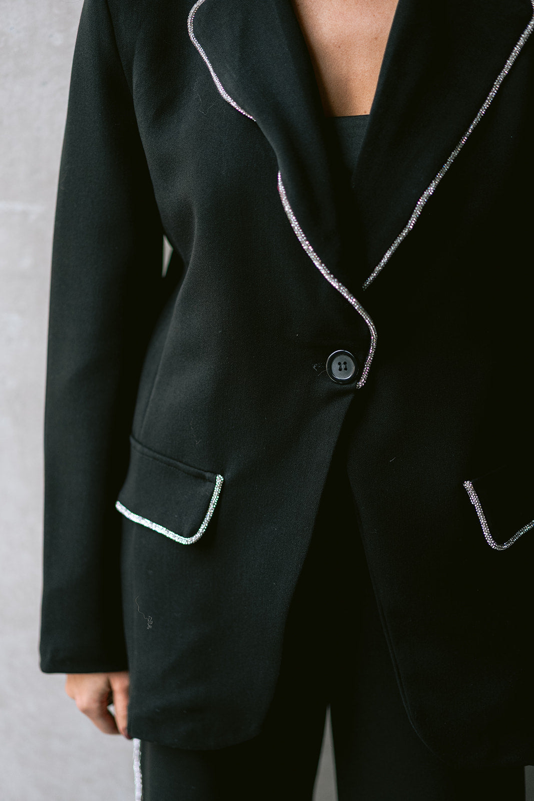 Serving midnight glam with a side of sparkle. This black tailored suit is trimmed with dazzling diamanté strass along the lapels and pocket edges, giving classic tailoring a festive glow-up.