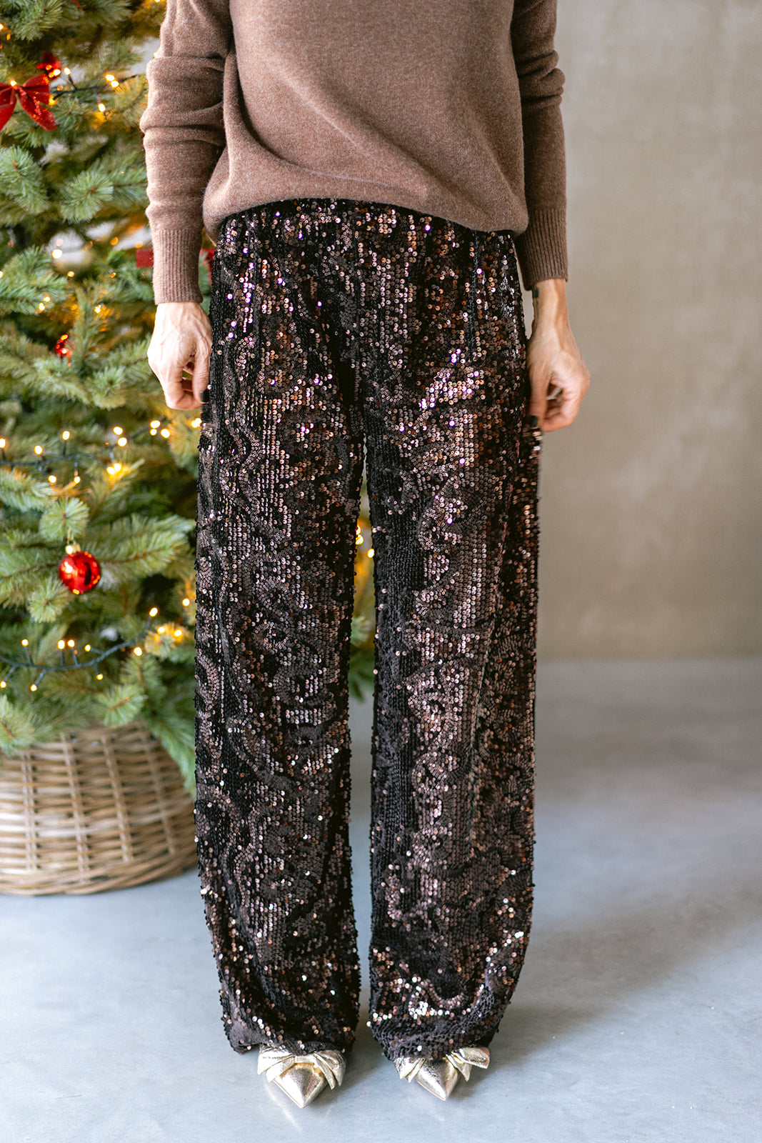 Step into the season like a disco dream in these loose brown sequin trousers. With their relaxed fit and full-on sparkle, they’re made for dancing, laughing, and living your best festive life. Warning: they will steal the spotlight.
