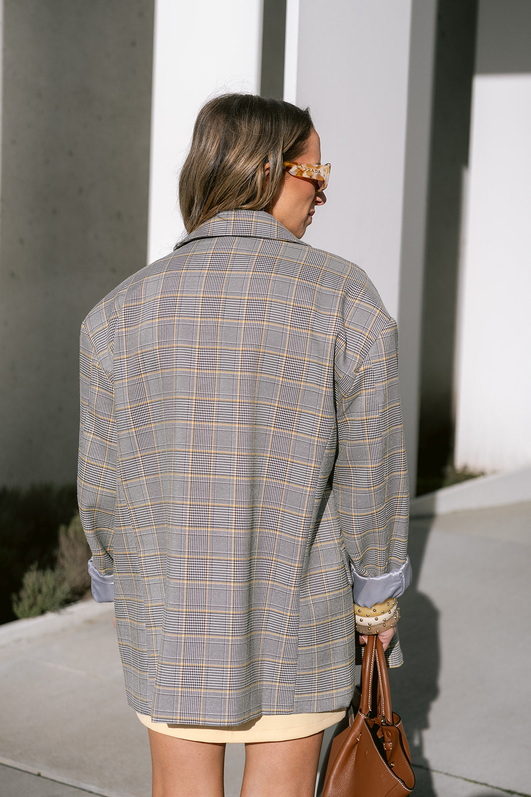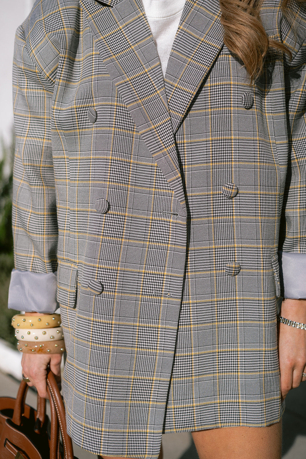 A sharp double-breasted blazer with a refined checkered pattern and statement-making wide lapels.