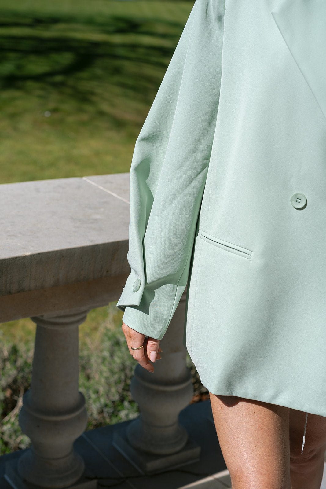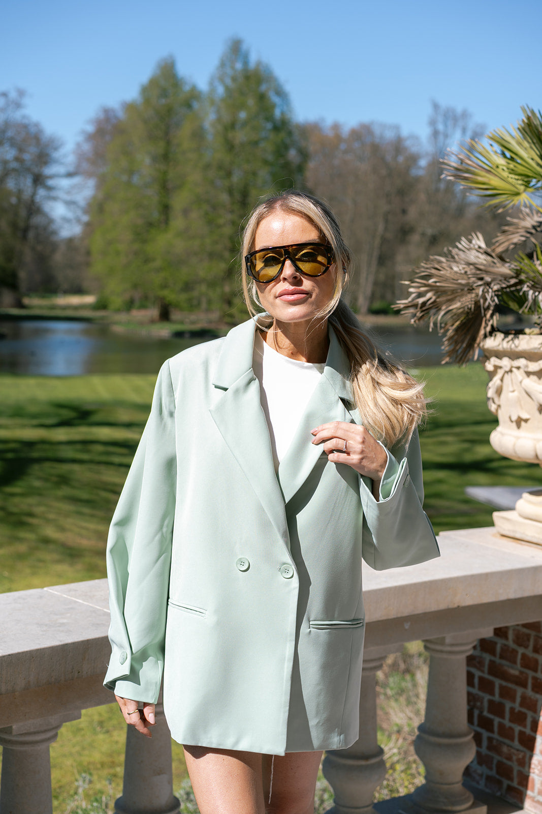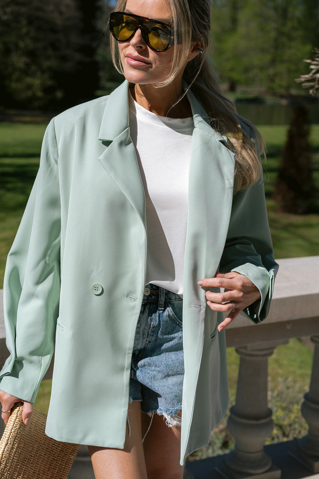 Sharp, structured, and unmistakably polished, this blazer is the kind of piece that pulls every outfit together. It has an oversized, relaxed fit with a V-neckline, wide notch lapels, long sleeves, and a double-breasted button closure, crafted in a textured bouclé-inspired fabric that gives it a luxurious, tactile finish. Wear it over anything and own the room.