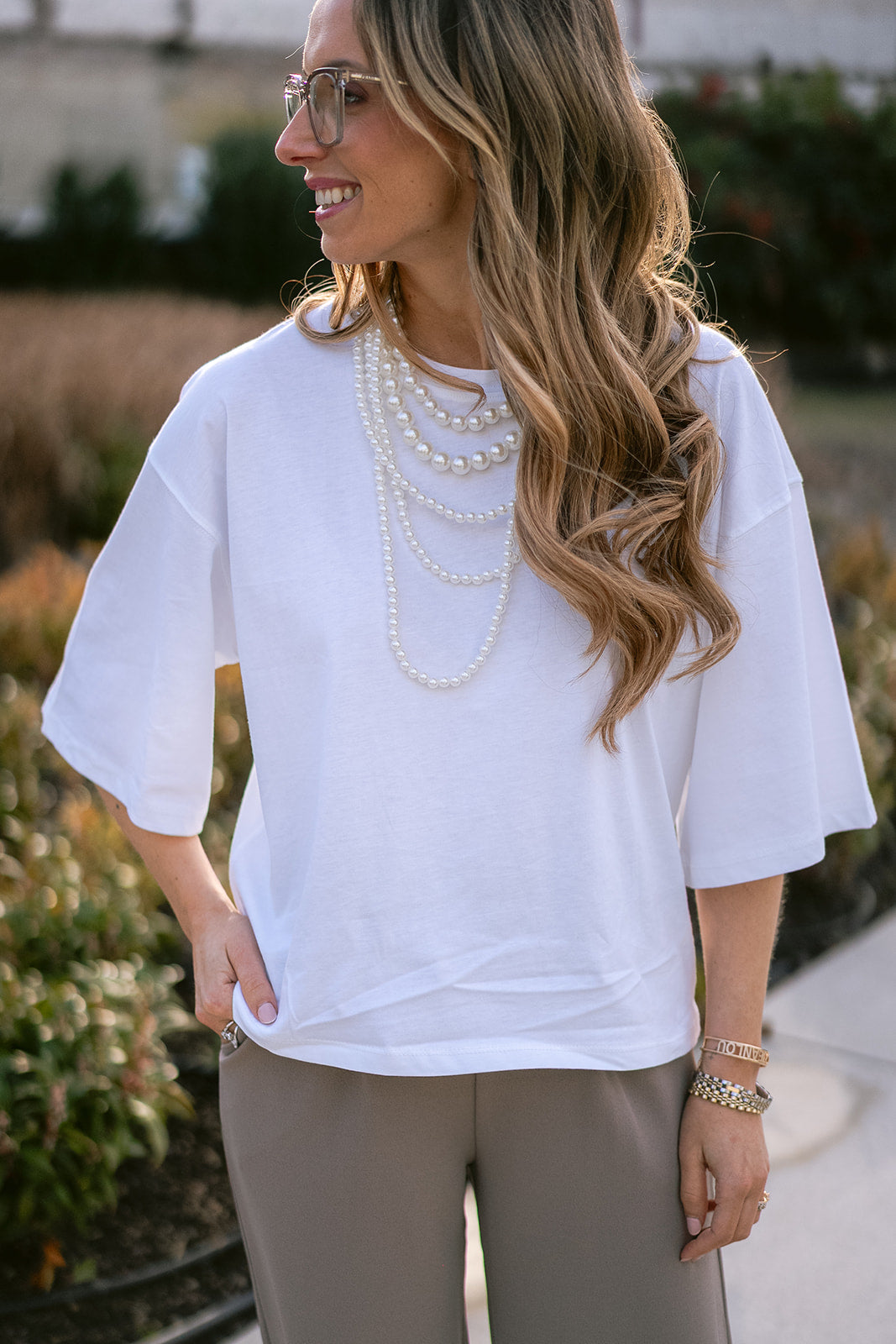 Effortless cool with the Astrae Oversized T-shirt. This laid-back essential has relaxed, roomy proportions and charming elbow-length sleeves that strike the perfect balance between cozy and chic.