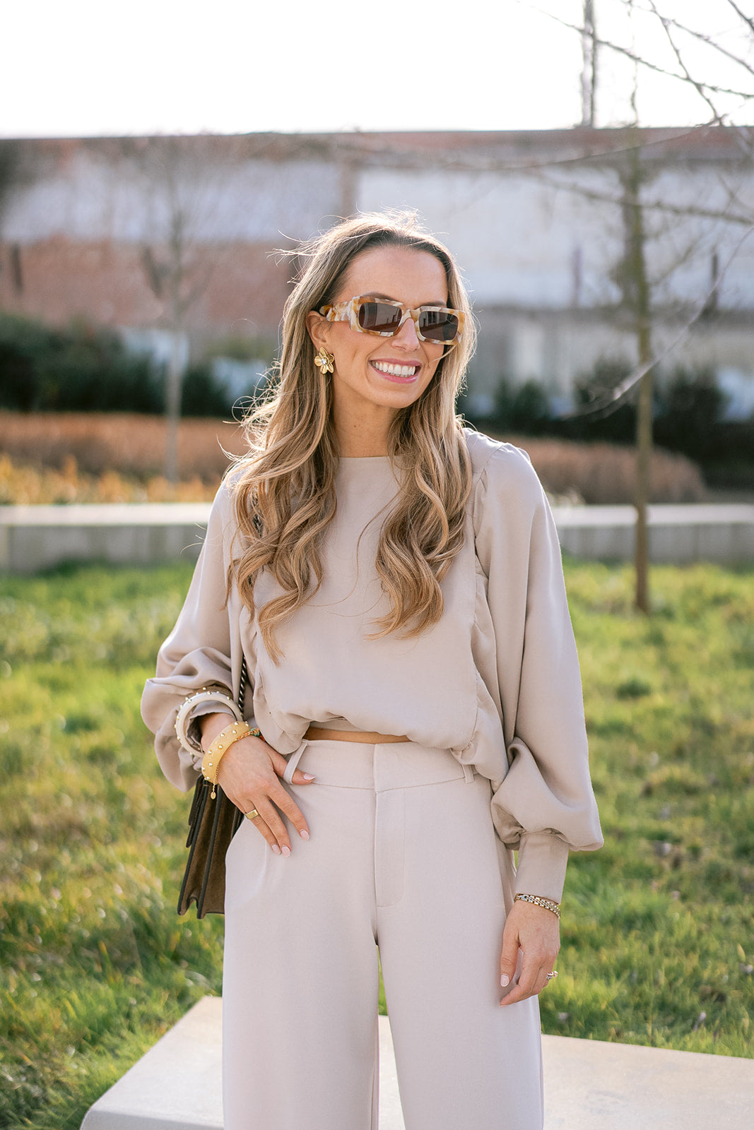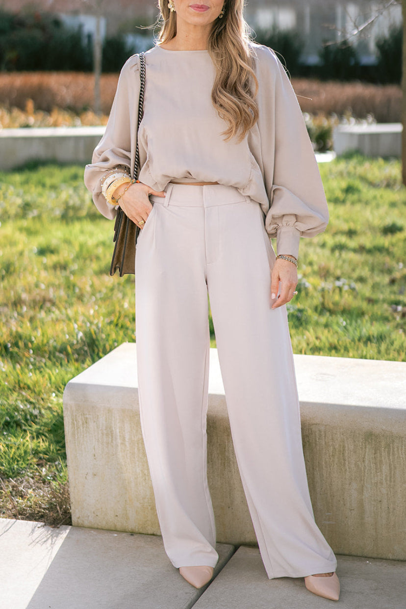 Tailored wide-leg trousers with a button-accented waistband. The relaxed silhouette has a timeless appeal, perfect for the office or dressed occasions.