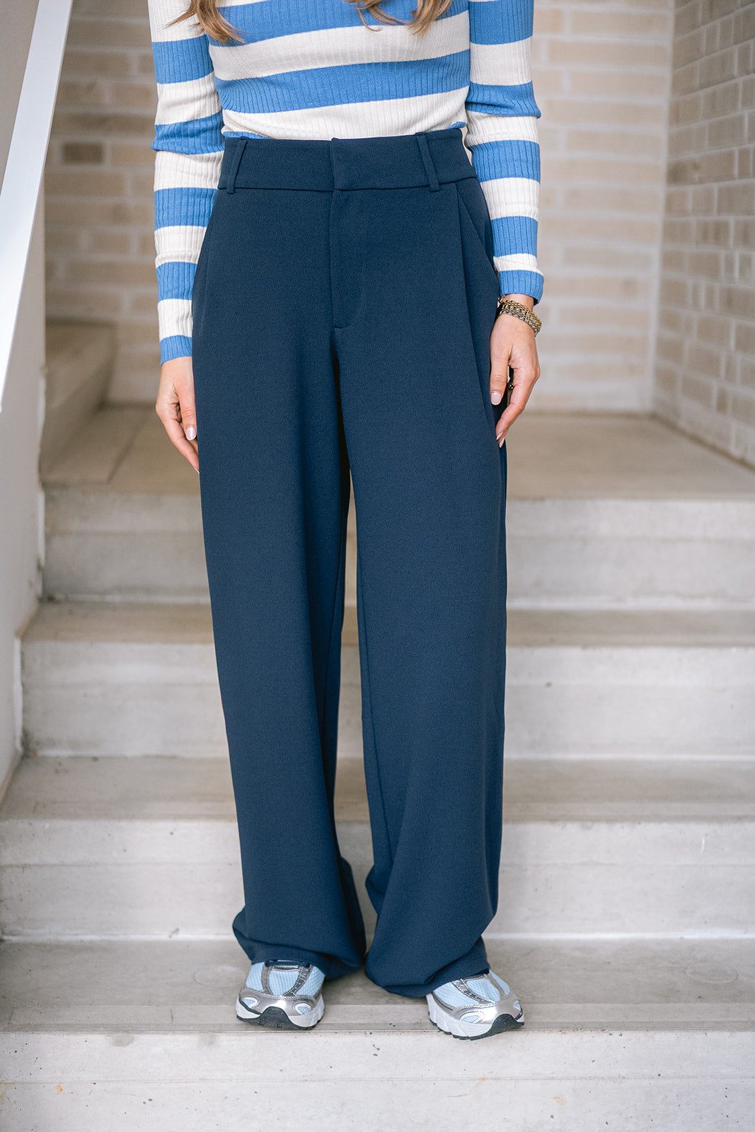 Tailored wide-leg trousers with a button-accented waistband. The relaxed silhouette has a timeless appeal, perfect for the office or dressed occasions.