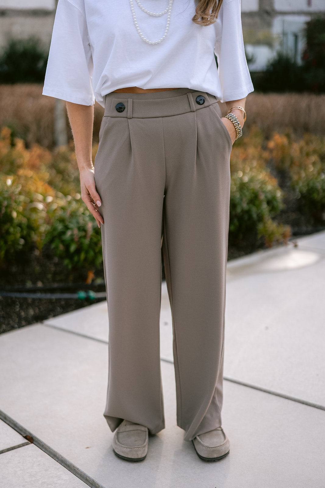 Tailored wide-leg trousers with a button-accented waistband. The relaxed silhouette has a timeless appeal, perfect for the office or dressed occasions.