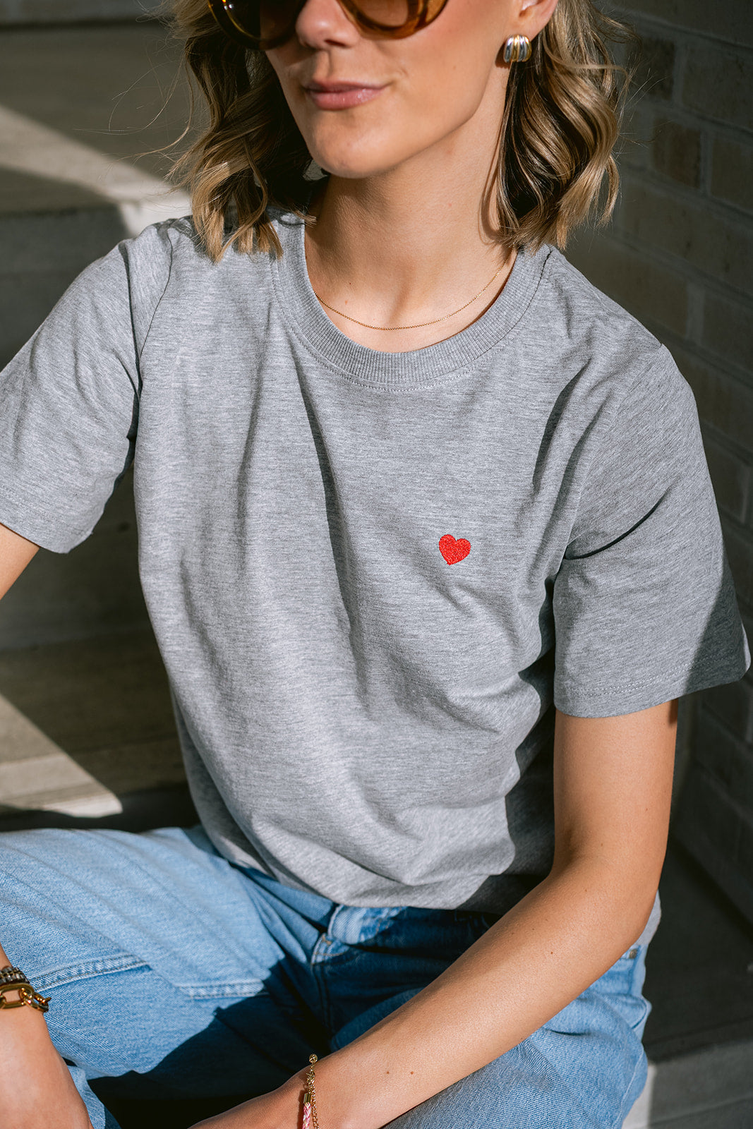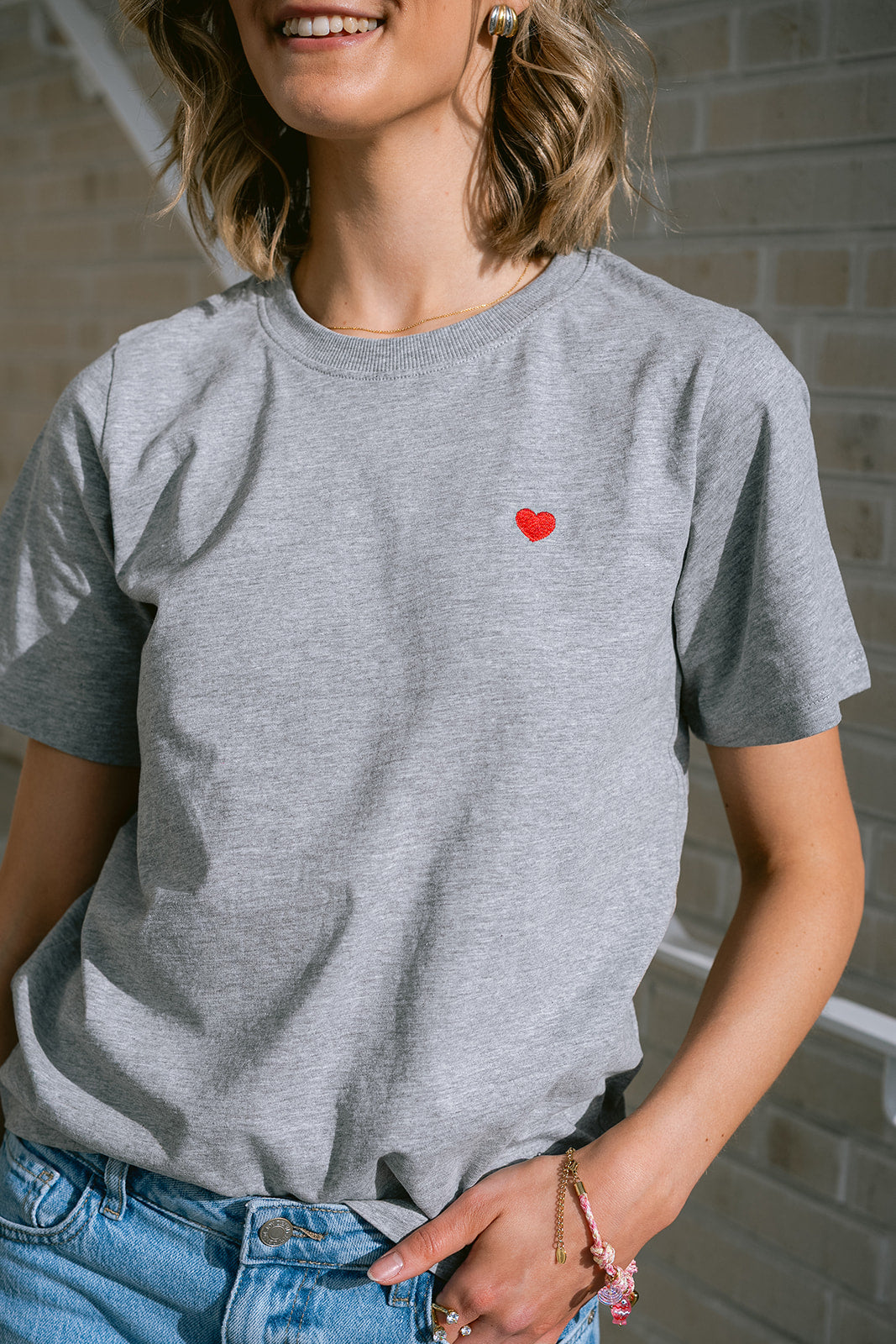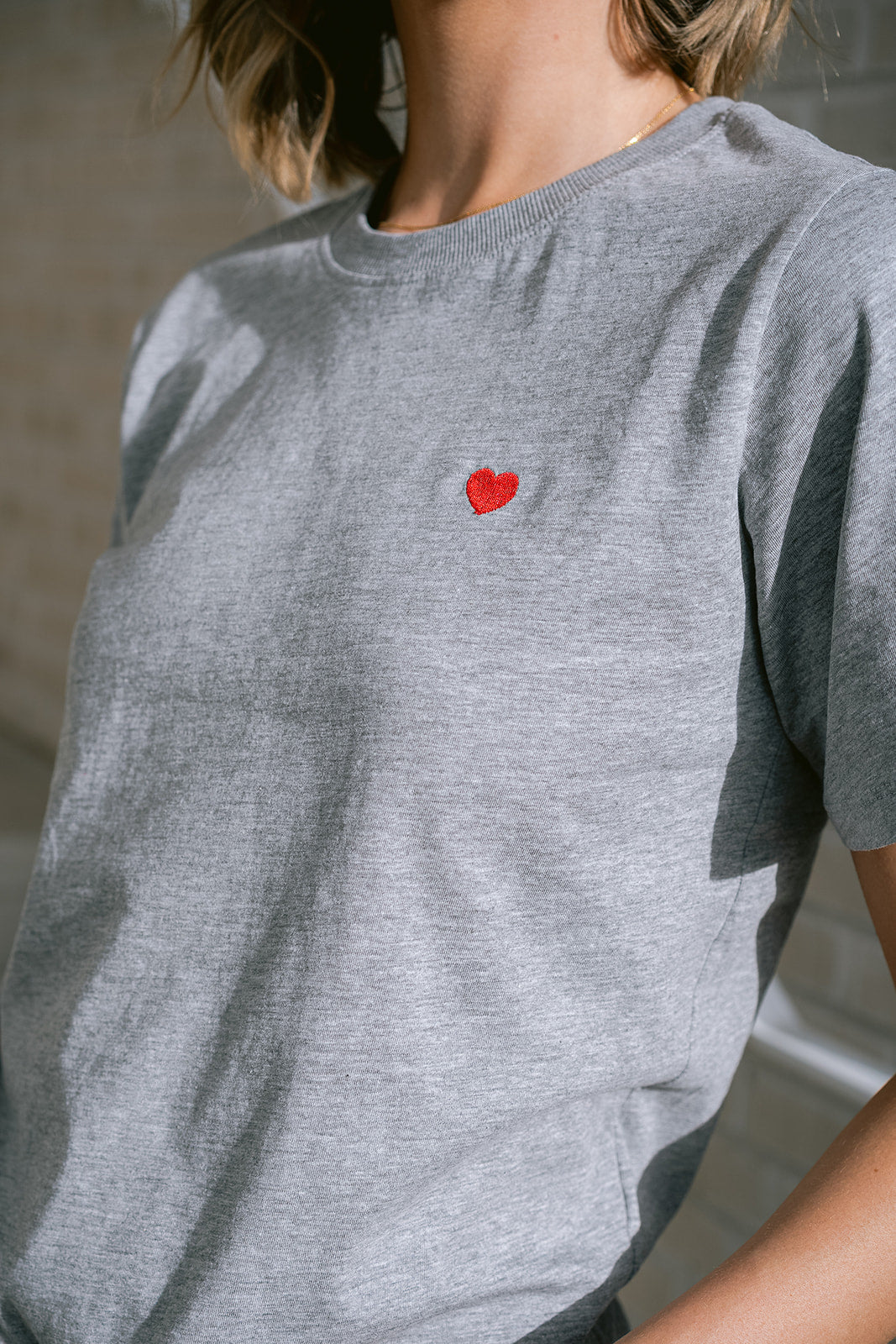 Soft grey tee with a charming red heart on the chest. Classic crew neck keeps things timeless while the heart adds just the right touch of personality to your everyday rotation.