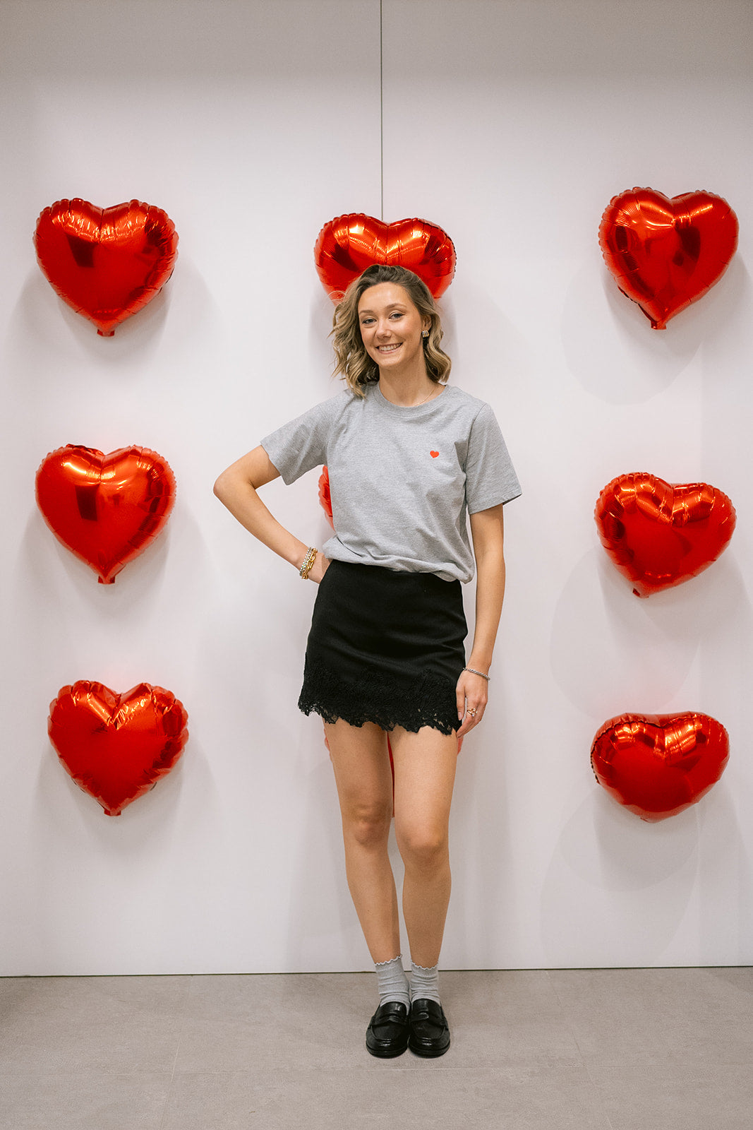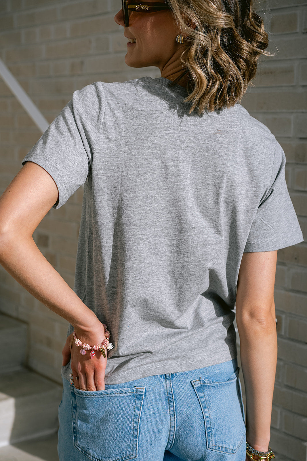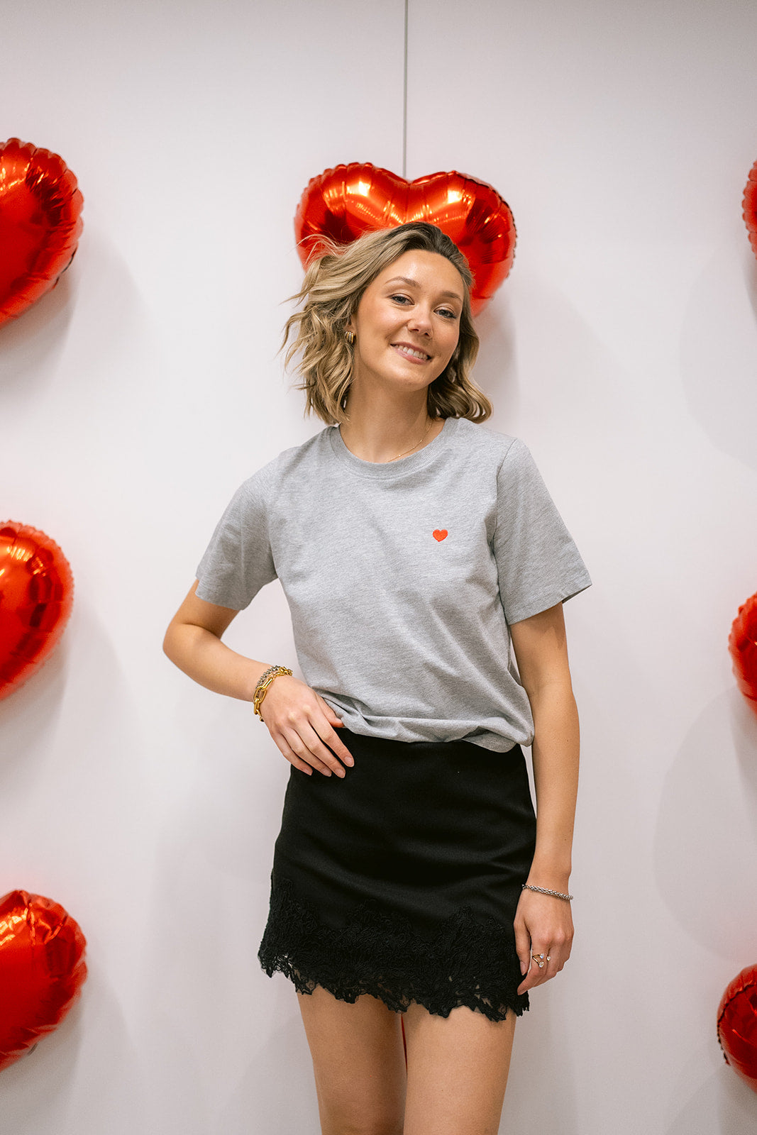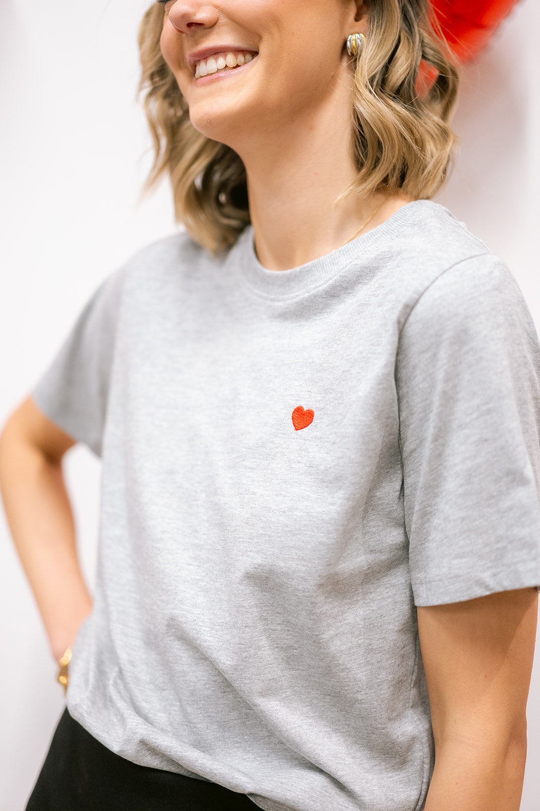 Soft grey tee with a charming red heart on the chest. Classic crew neck keeps things timeless while the heart adds just the right touch of personality to your everyday rotation.