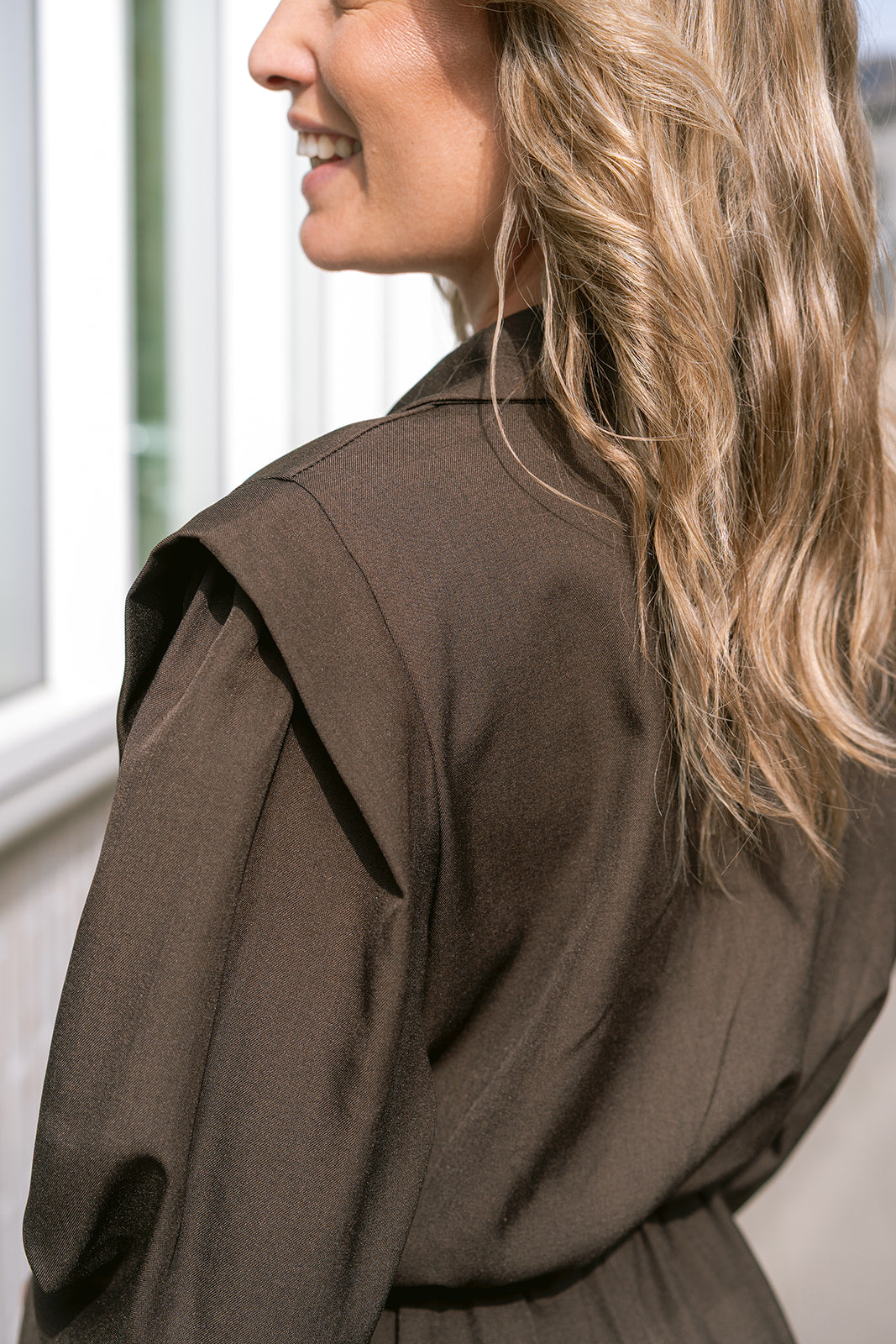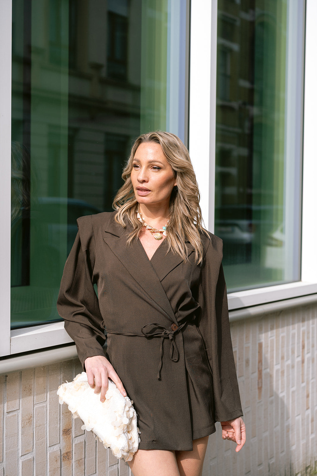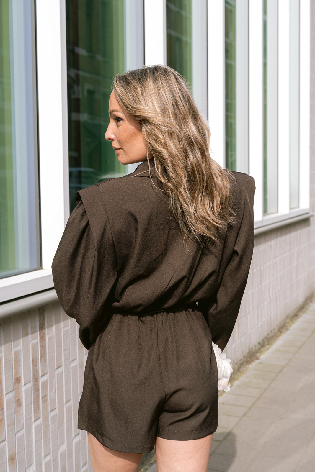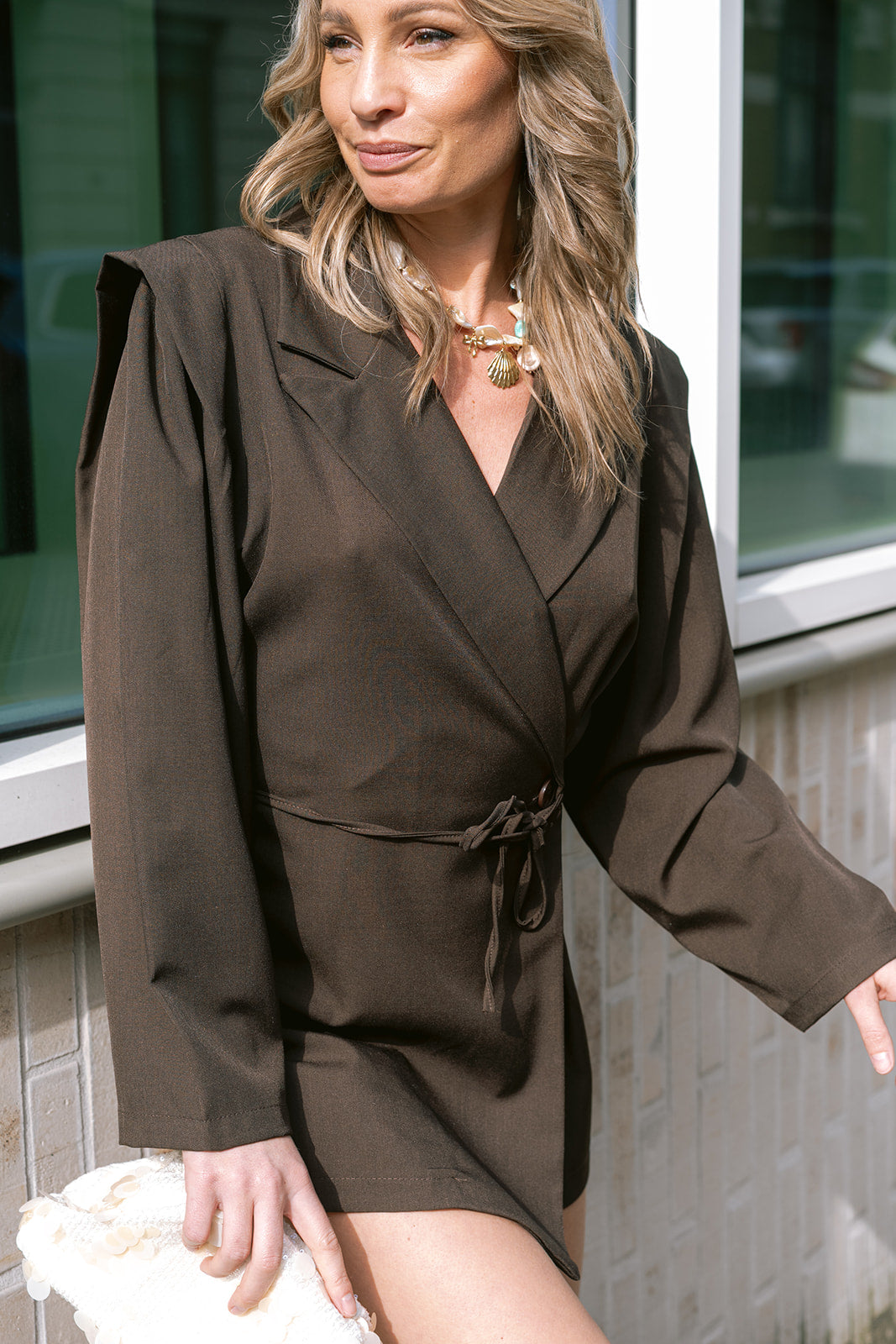 Upgrade your wardrobe with the Céliane Playsuit in rich dark brown. This sophisticated piece has long sleeves and a flattering wrap design with button and tie closure at the waist, creating a refined silhouette.