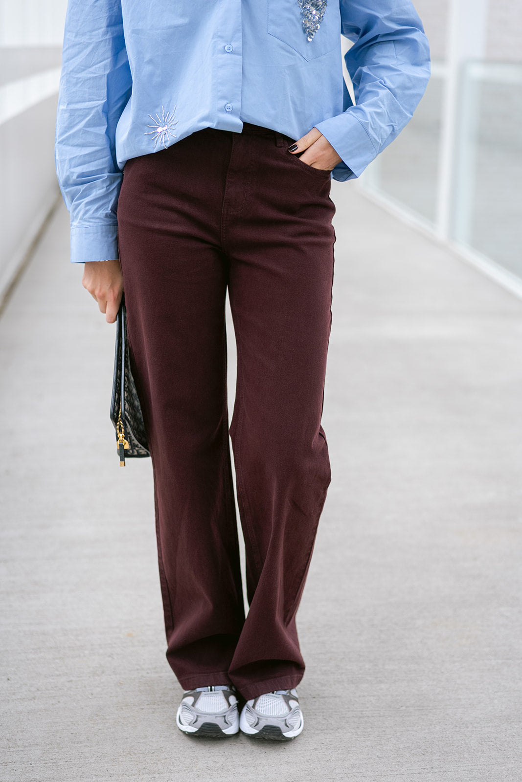 These bordeaux denim trousers are giving rich-girl autumn. Cut in a slightly wide leg silhouette. The deep wine hue adds a luxe pop to your wardrobe.