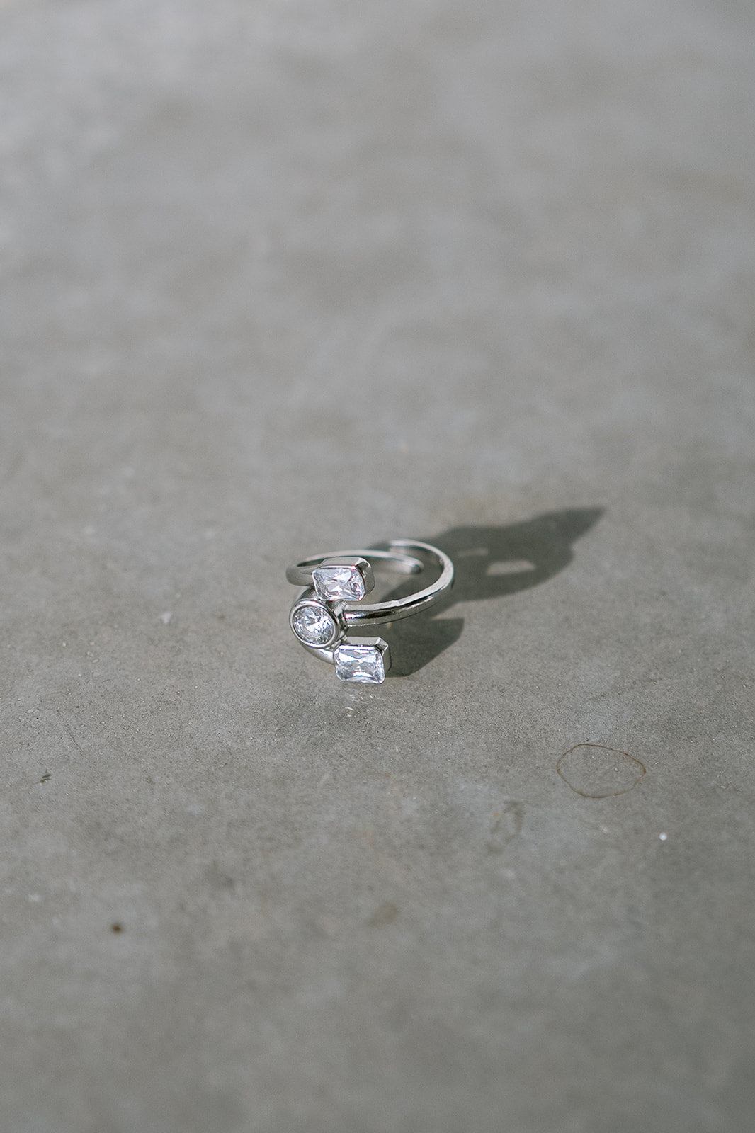A silver ring that plays with perspective, three luminous stones arranged across sleek, interlocking bands.