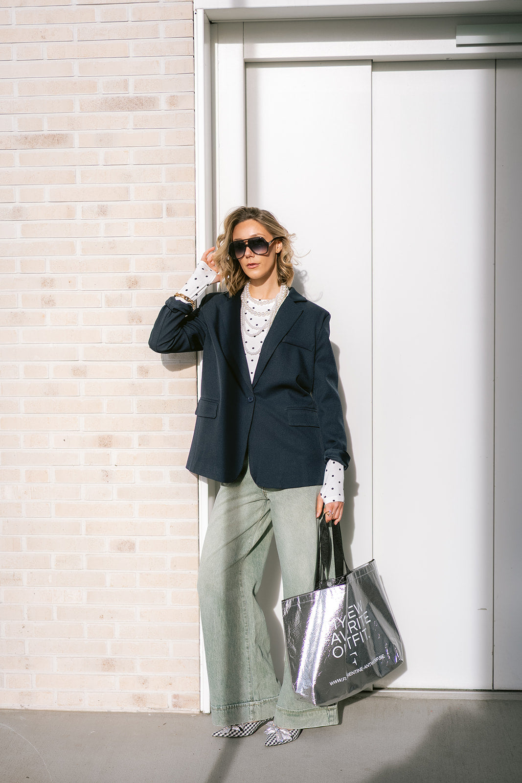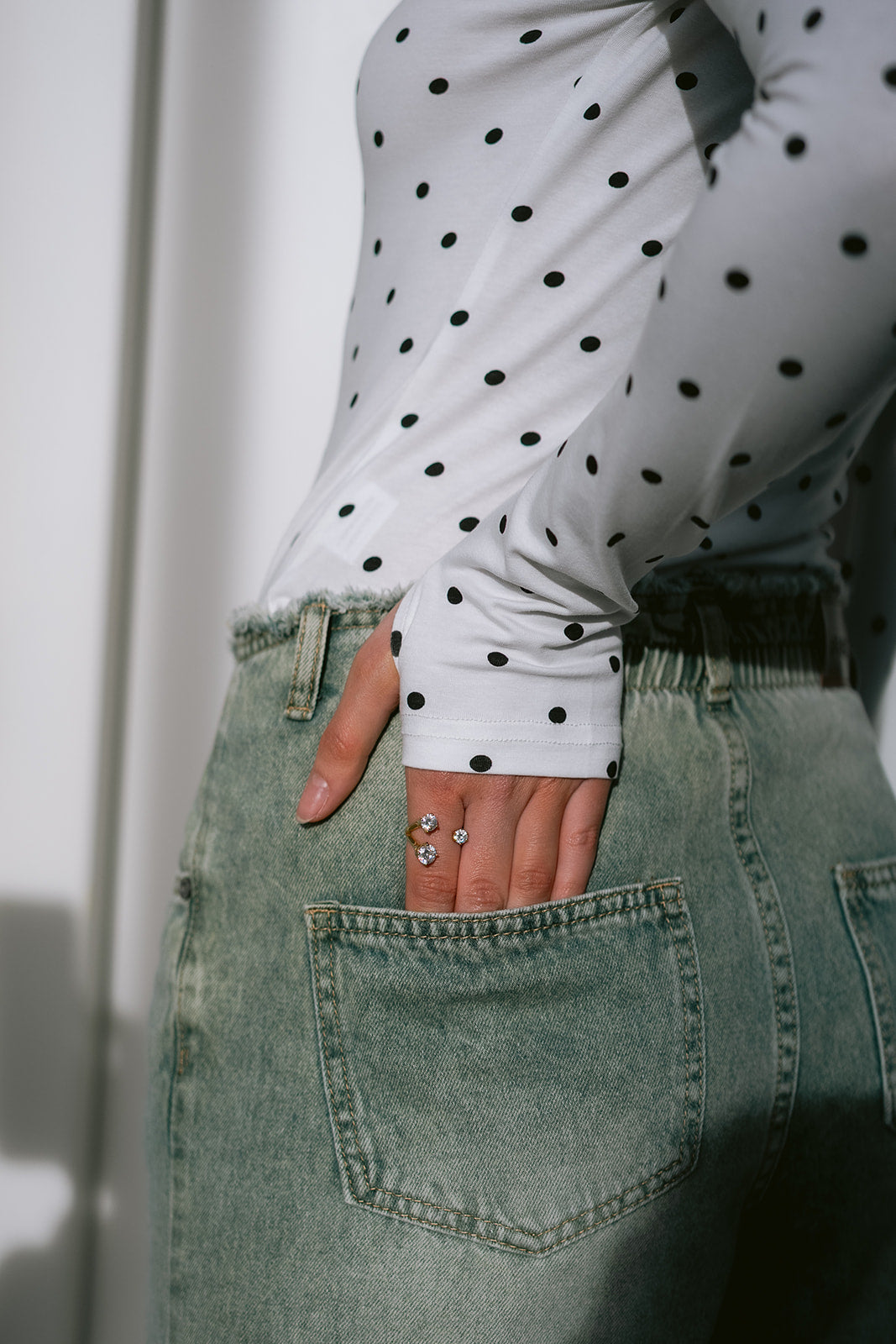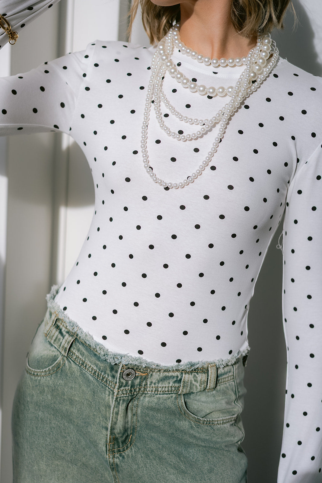 A cropped polka dot top silhouette with long sleeves. Structured epaulettes at the shoulders add a distinctive touch.