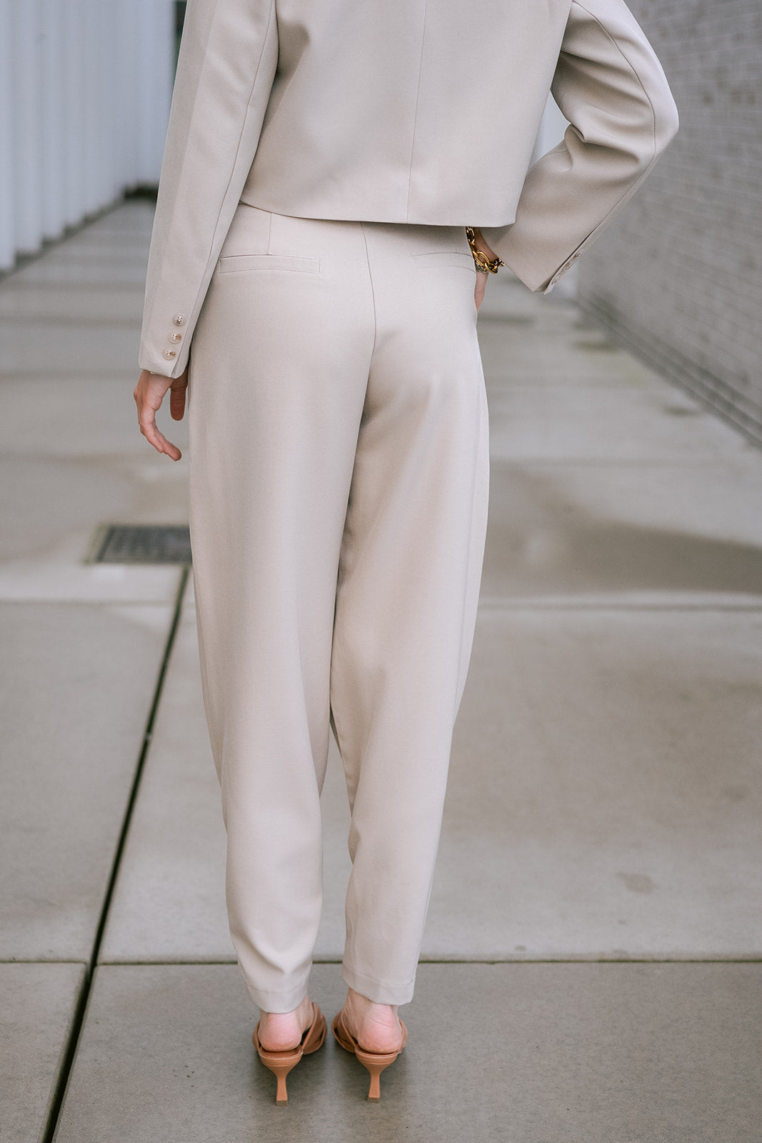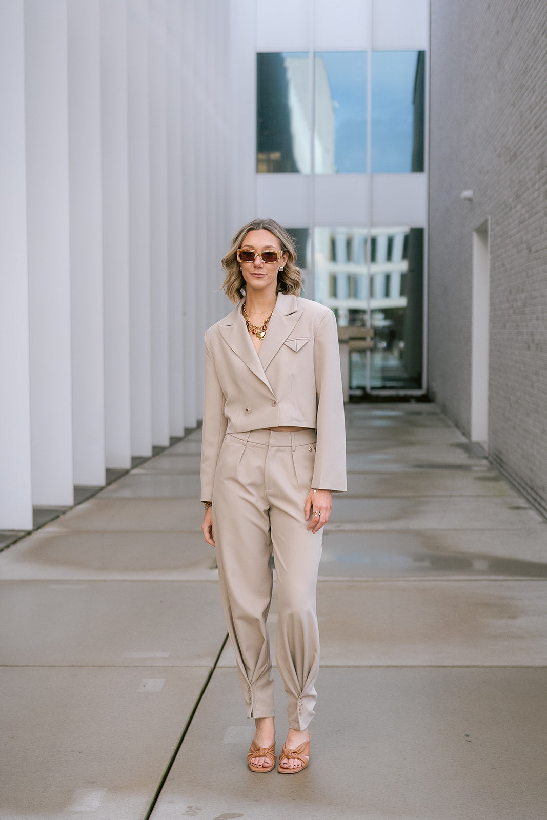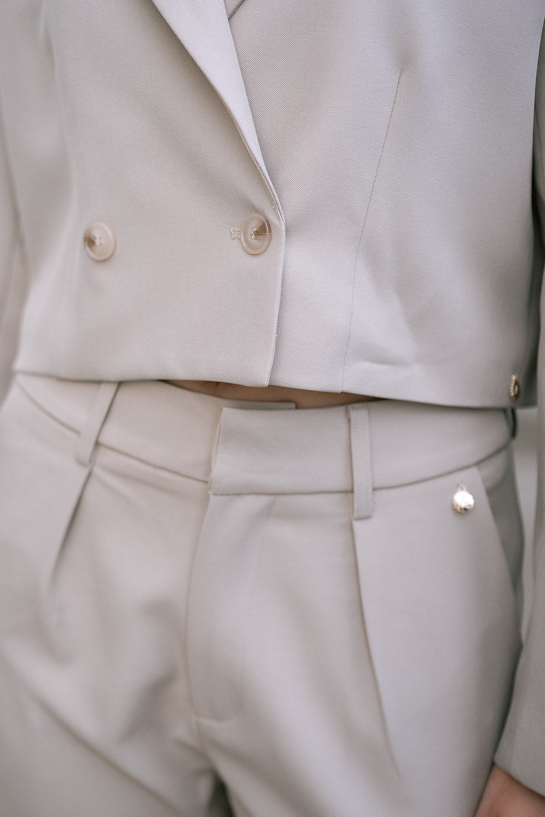 The Camélia Suit in Taupe, tailored sophistication meets modern flair. This chic two-piece has a cropped double-breasted blazer with its structured silhouette, paired with elegantly cinched ankle pants that create a flattering, contemporary line.