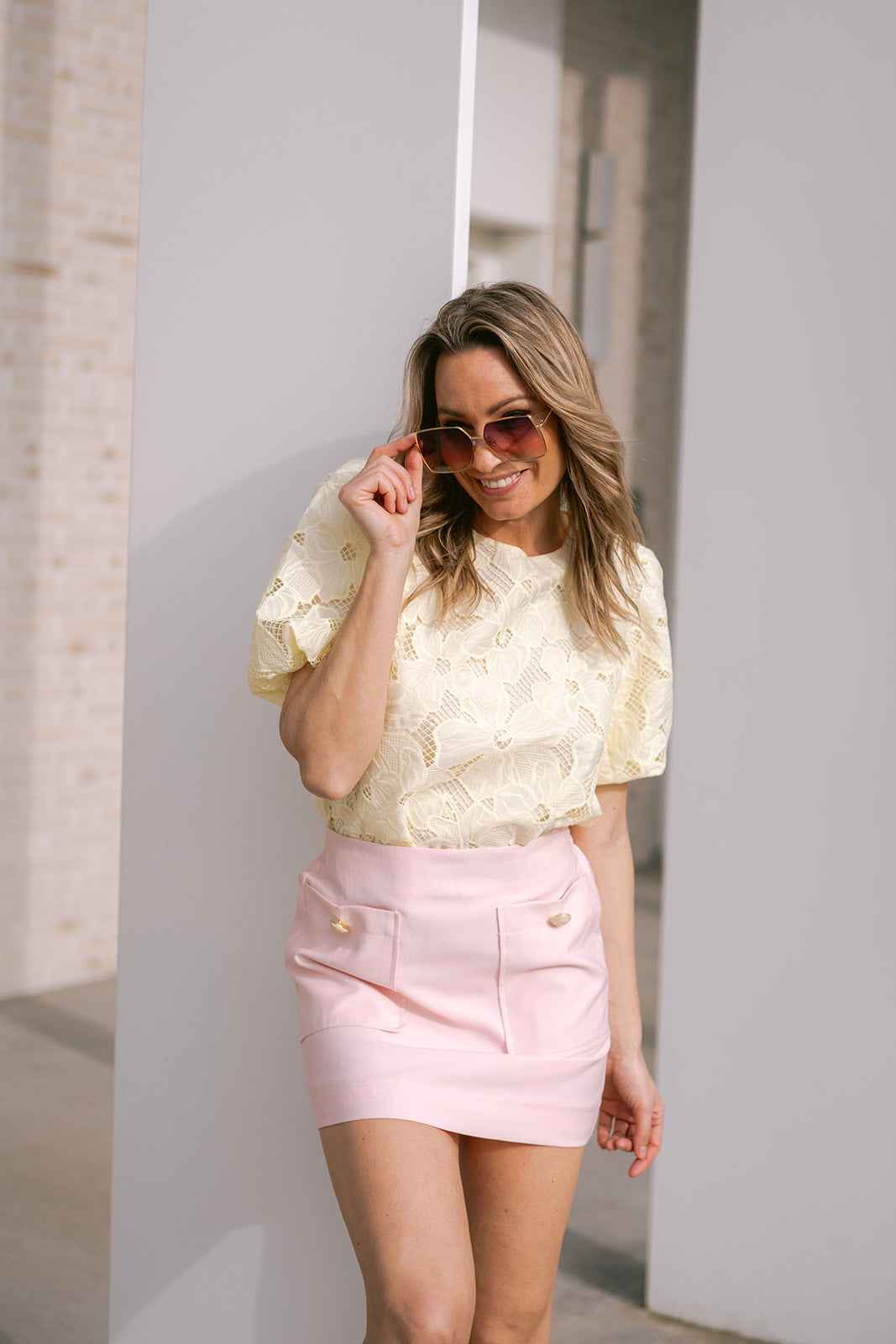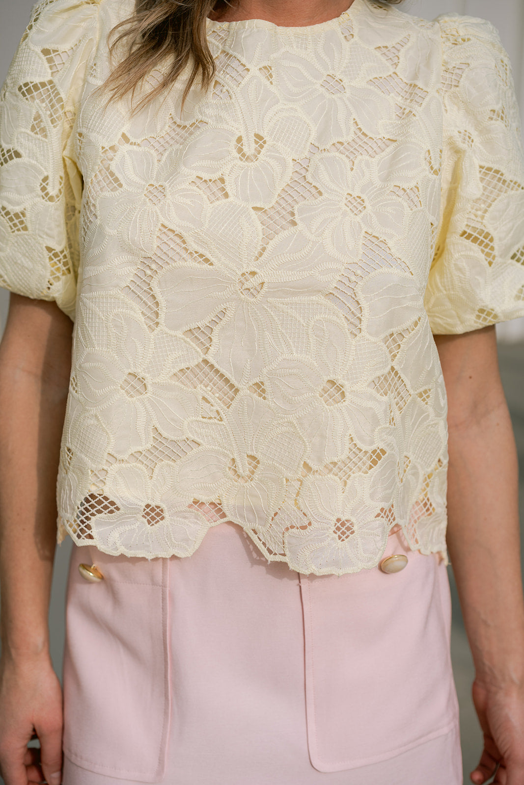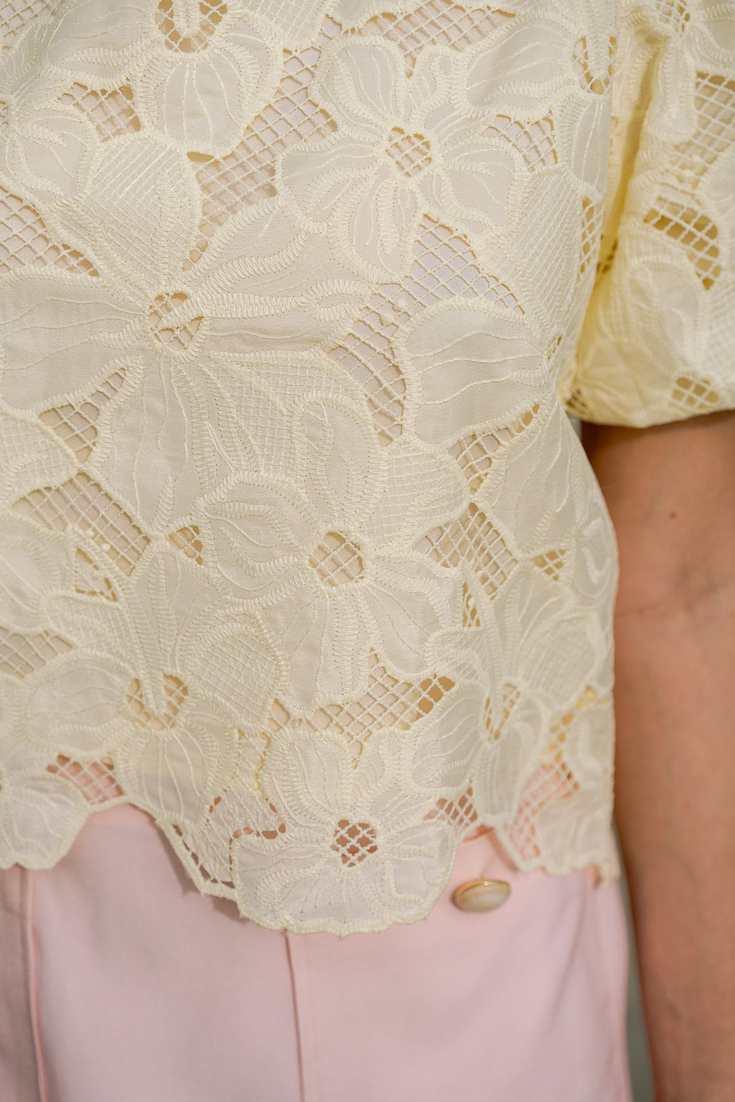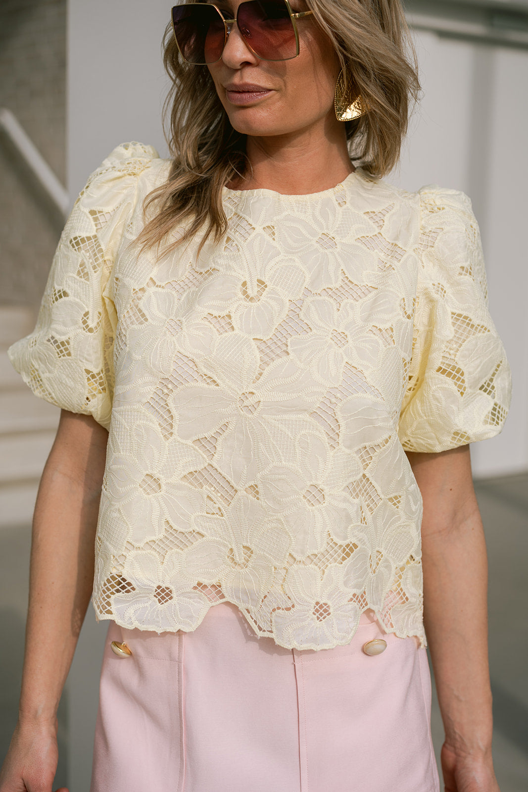 Lace blouse in soft butter yellow, with charming short balloon sleeves that add playful volume. The design has a flattering V-cut back with an elegant tie detail running shoulder to shoulder, creating a sophisticated focal point.