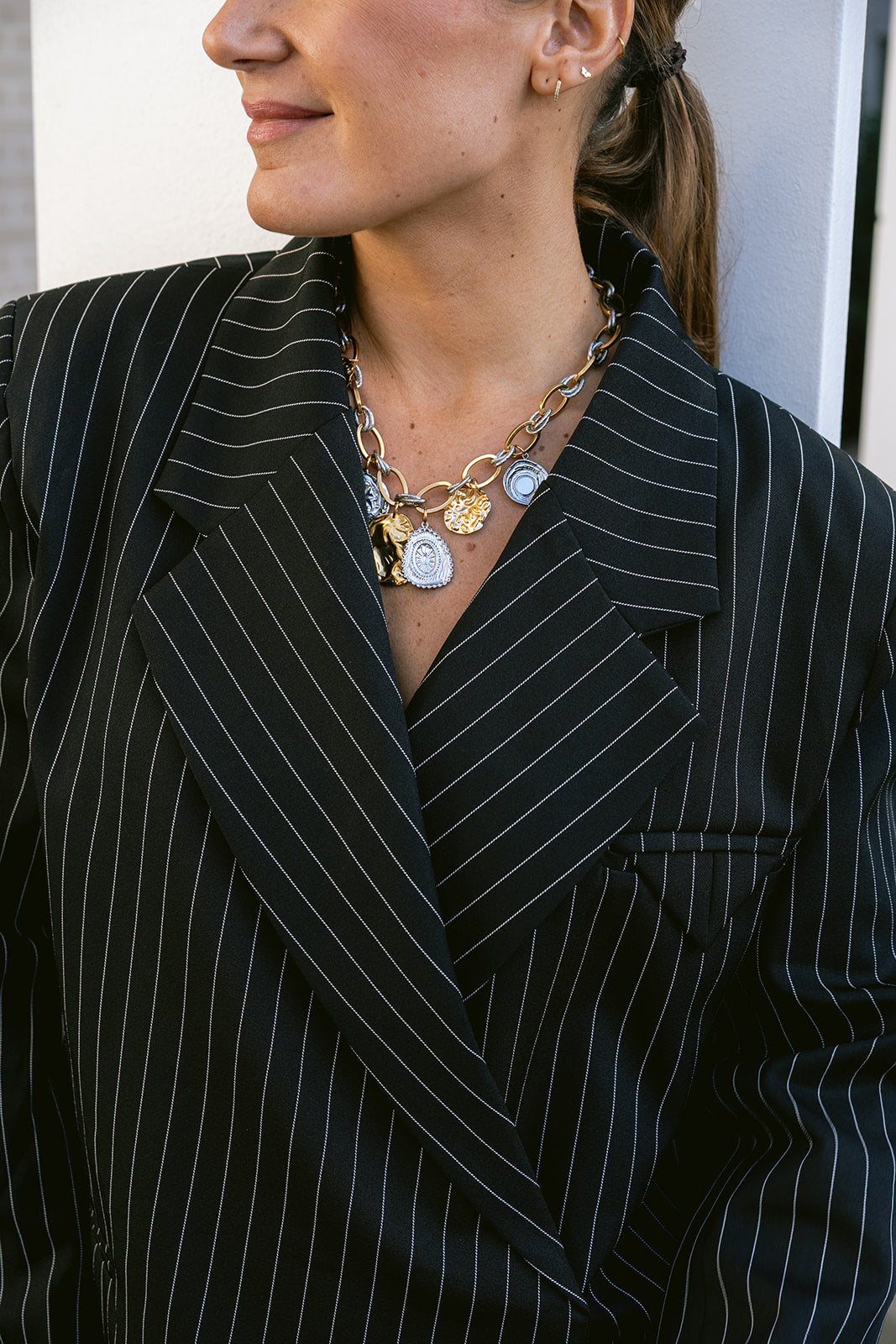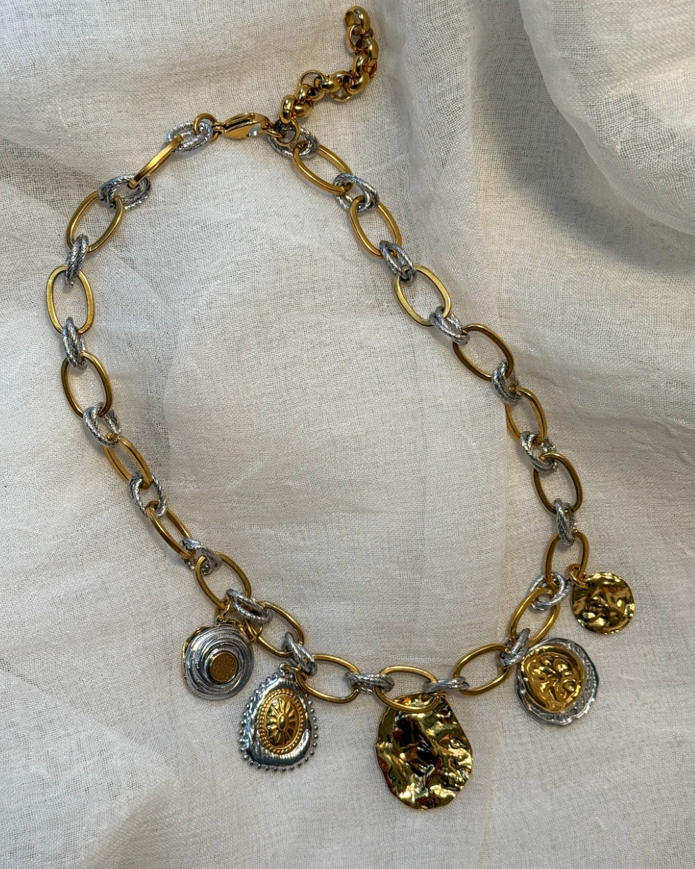 An elegant statement necklace with a playful mix of gold and silver-coloured links, finished with various organically shaped medallions. Every detail adds depth and character to the design, allowing the necklace to effortlessly enhance any outfit – from simple to distinctly chic.