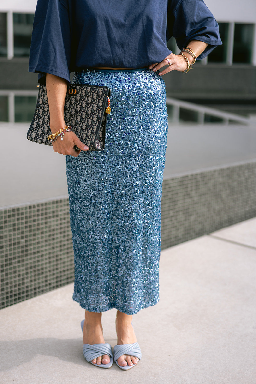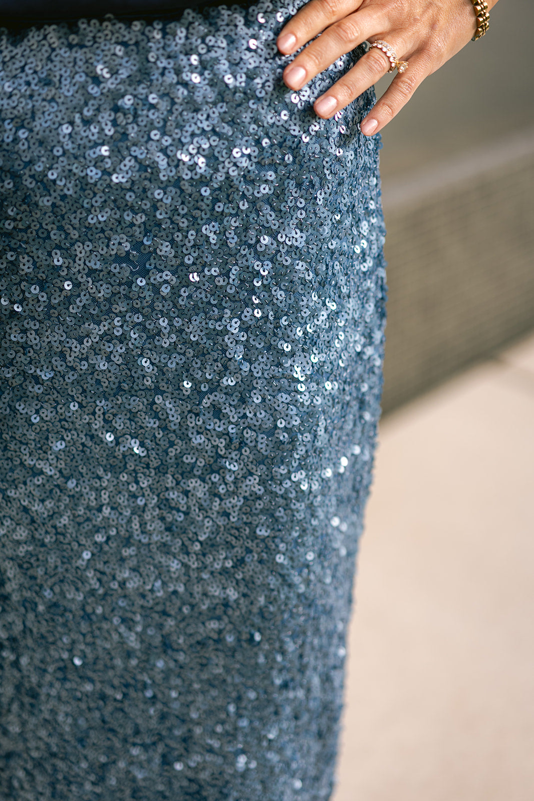 The Juryfala Skirt is a captivating mermaid blue sequin skirt that catches light with every movement. Its ankle-grazing length elegantly frames your footwear, while the straight silhouette creates a refined, streamlined look. A subtle back slit provides freedom of movement and comfort.