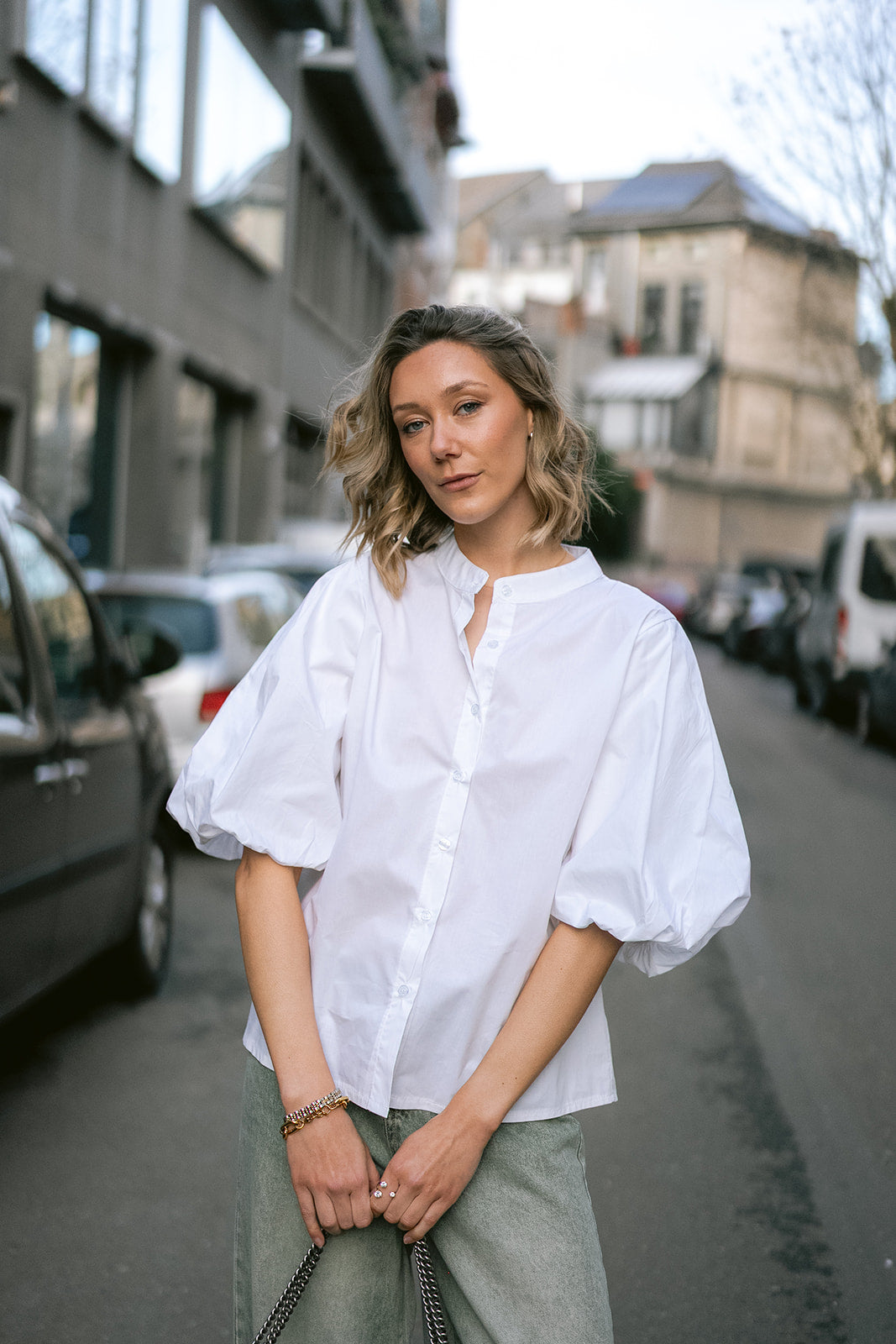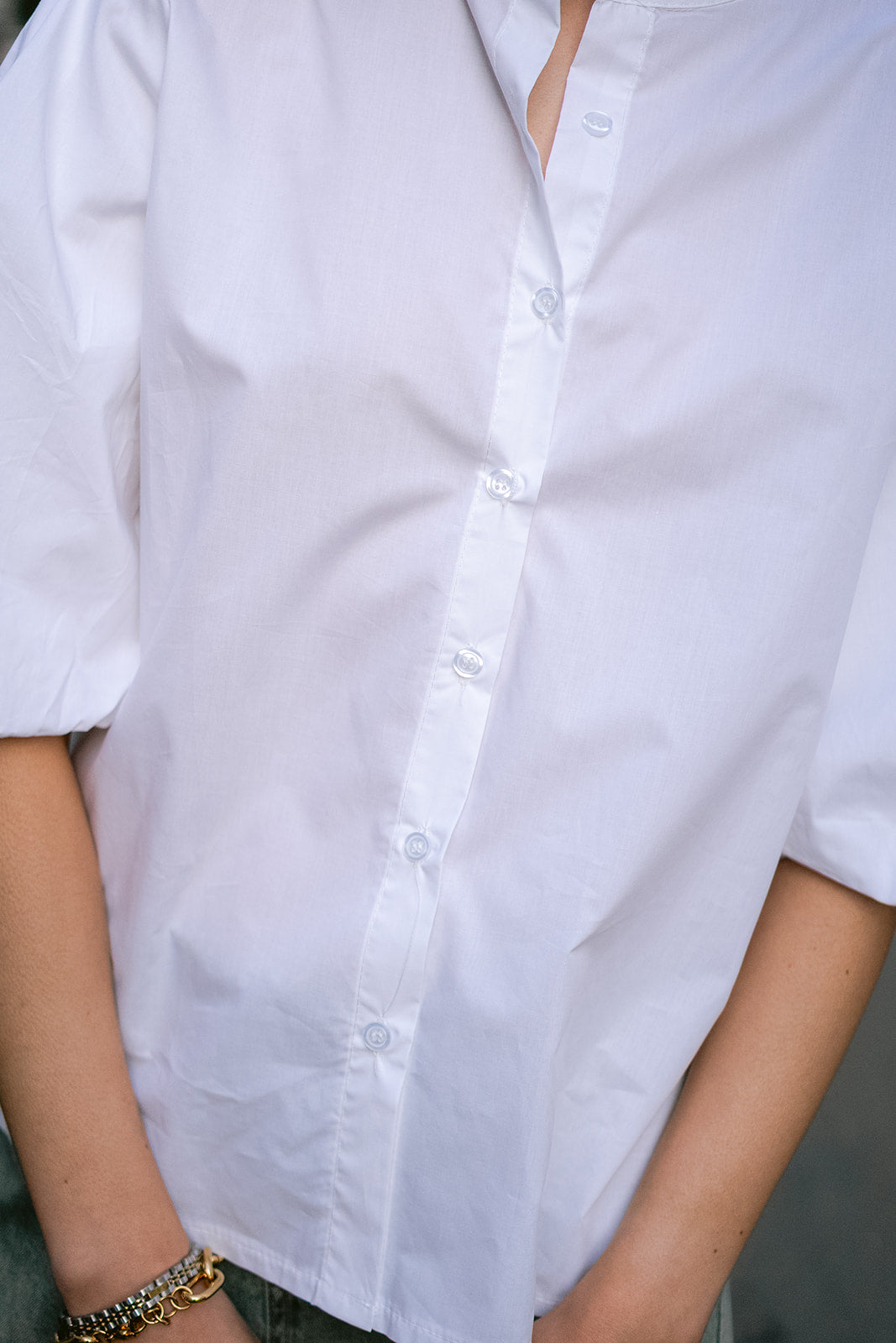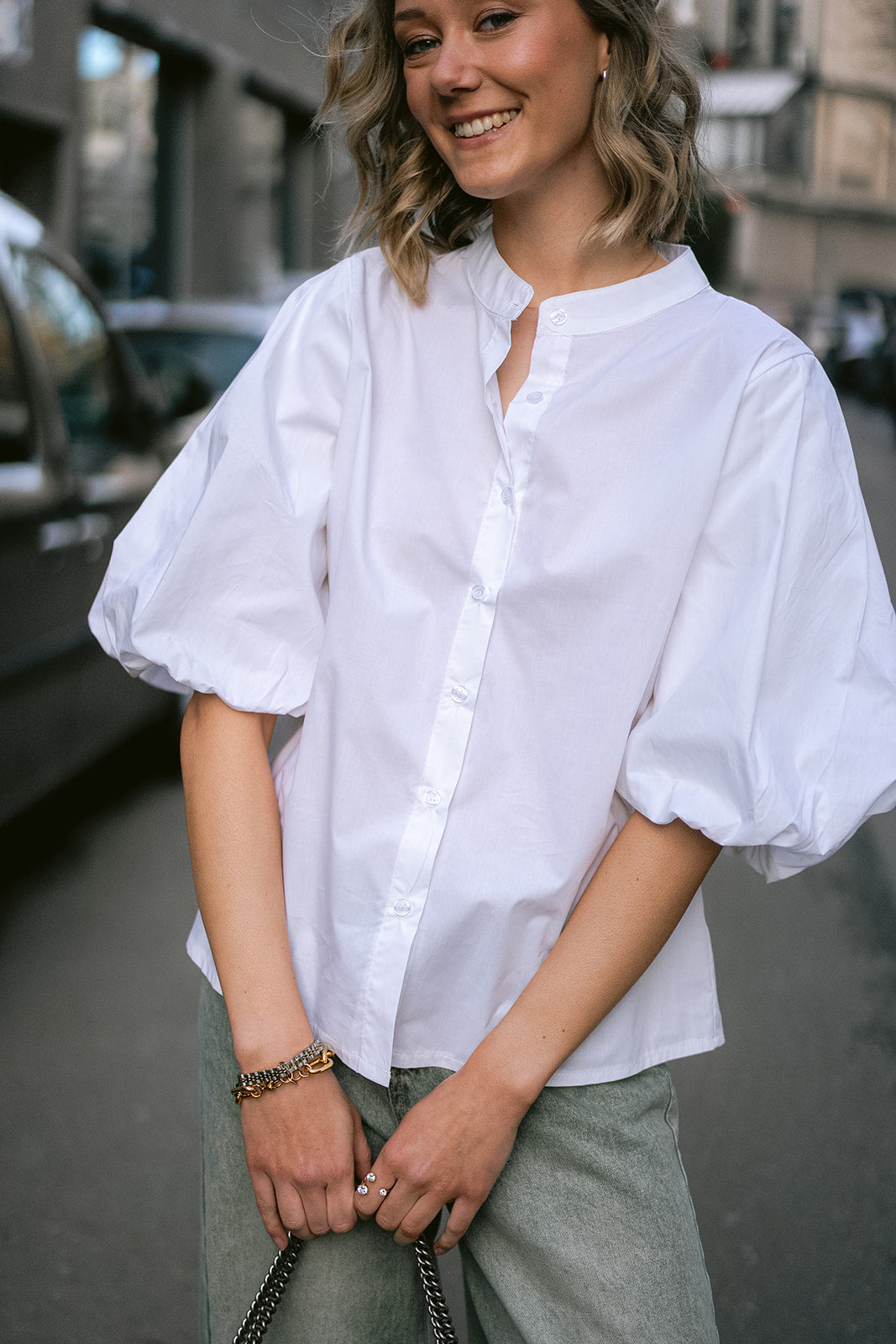 Crisp white blouse with a charming round neckline and practical front button closure. The standout feature? Delightfully voluminous balloon sleeves that gracefully taper at the elbows, adding a touch of whimsy to your everyday wardrobe.