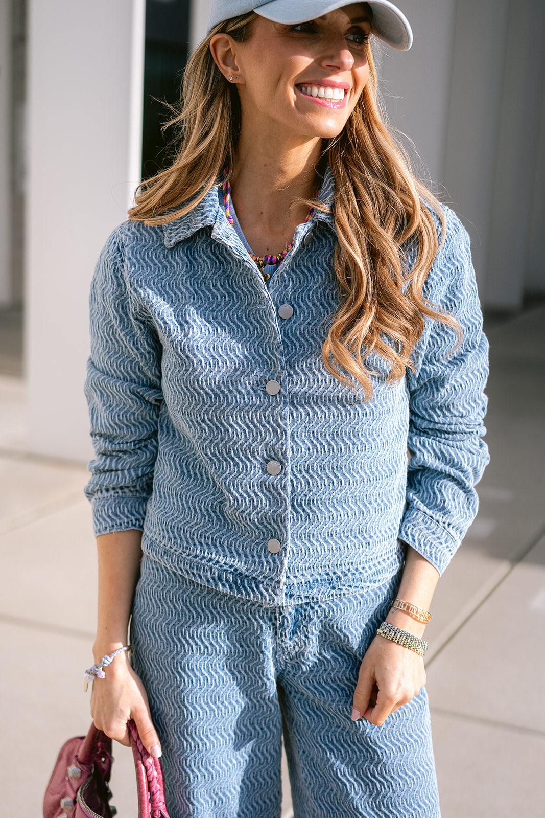 Your new denim obsession! This classic beauty rocks a wavy pattern, paired with a timeless collar. Front button closure keeps things simple and stylish, while the structured fit delivers that effortless cool-girl vibe.