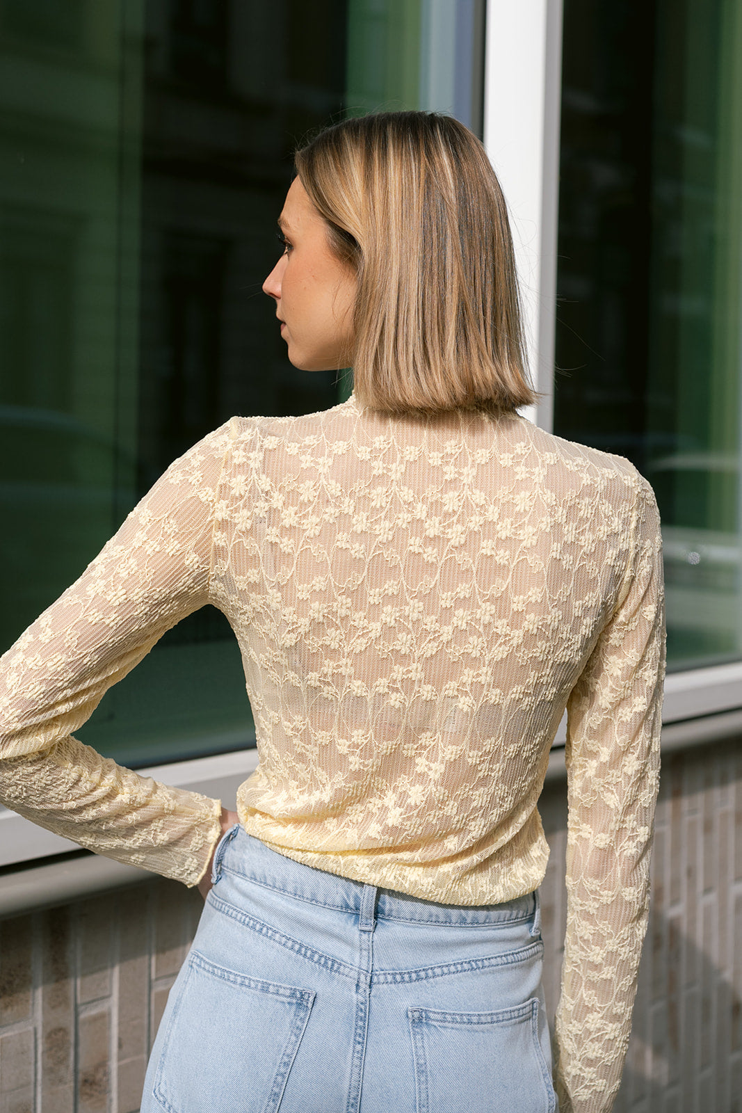 Delicate lace with effortless elegance. A charming top, complete with a graceful high neckline and flowing long sleeves.