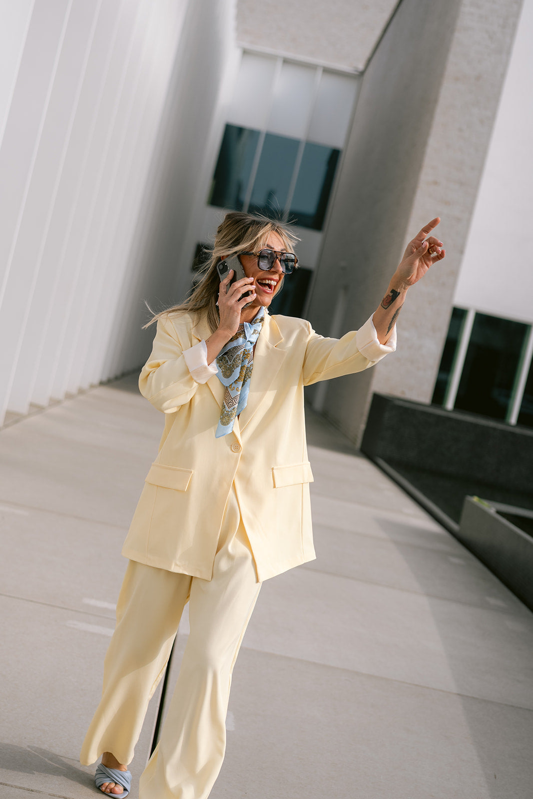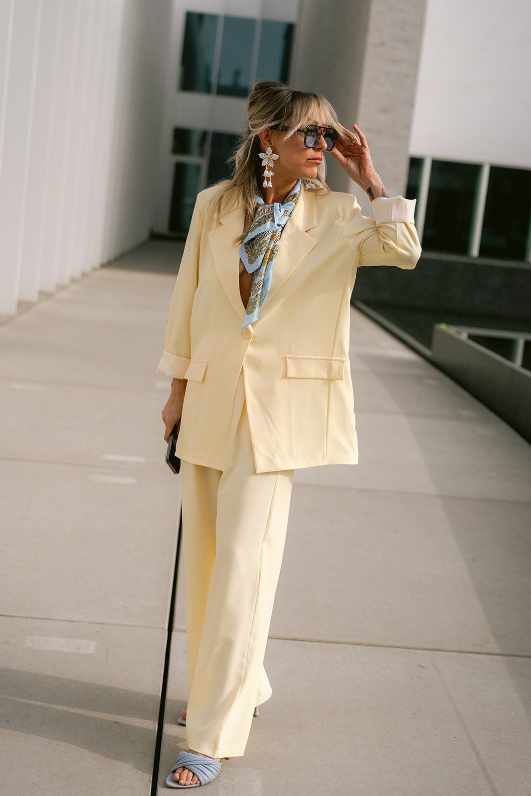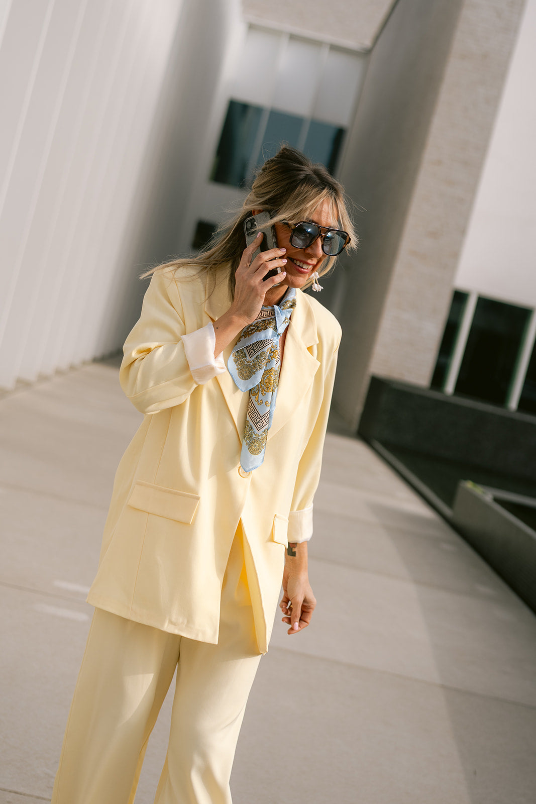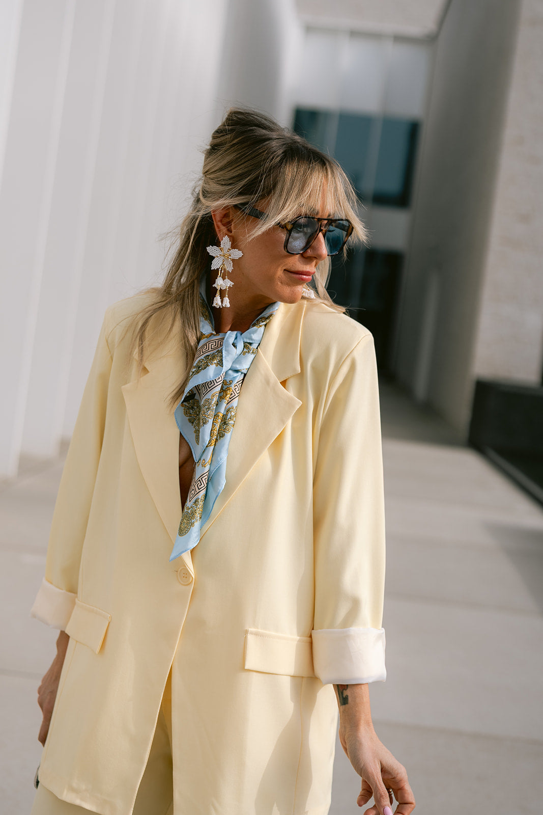Wrap yourself in some colour with this scarf, that has a gorgeous floral renaissance design in sunny yellow and soft blue tones.
