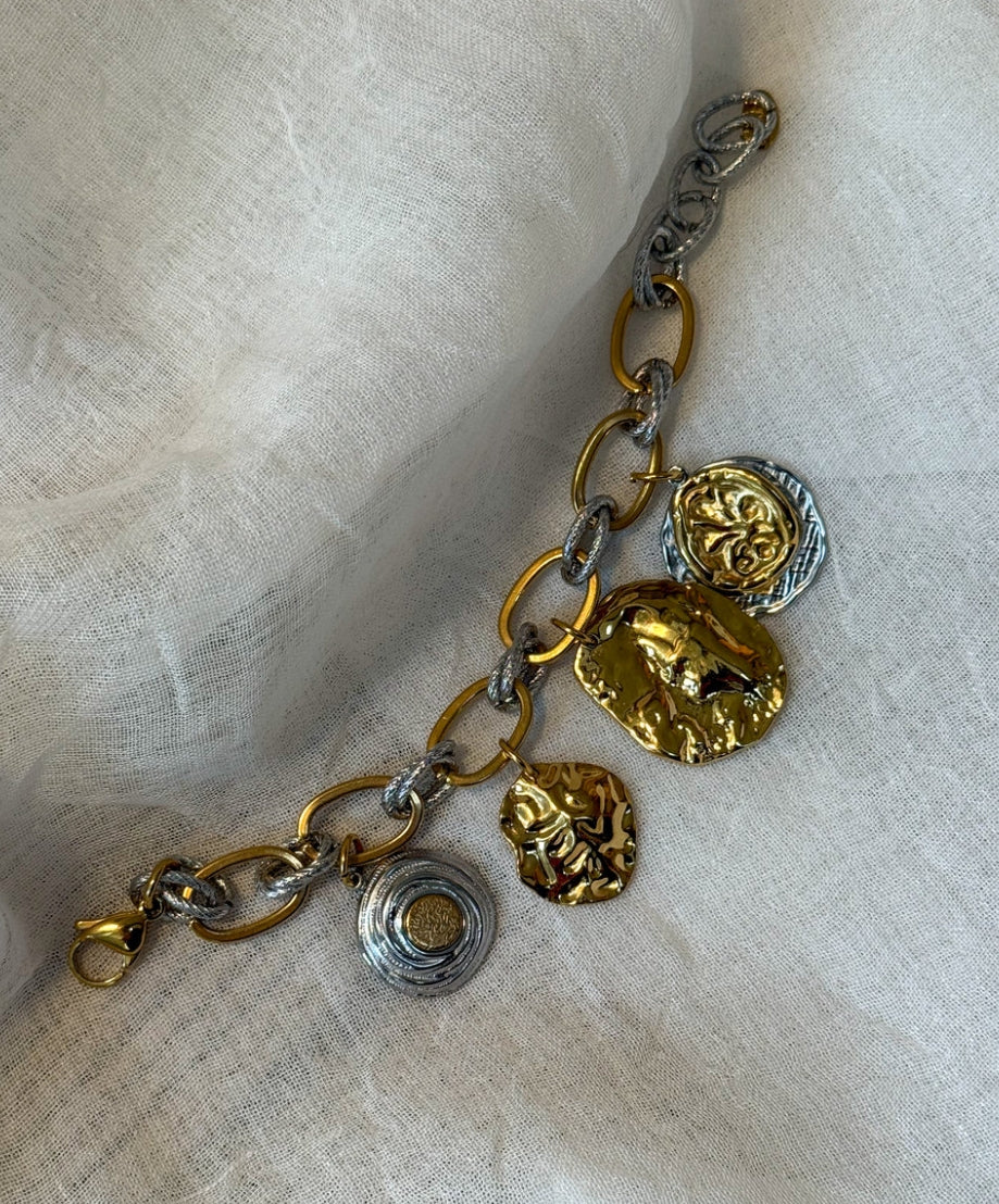 An elegant statement bracelet with a playful mix of gold and silver-coloured links, finished with various organically shaped medallions. Every detail adds depth and character to the design, allowing the bracelet to effortlessly enhance any outfit – from simple to distinctly chic.