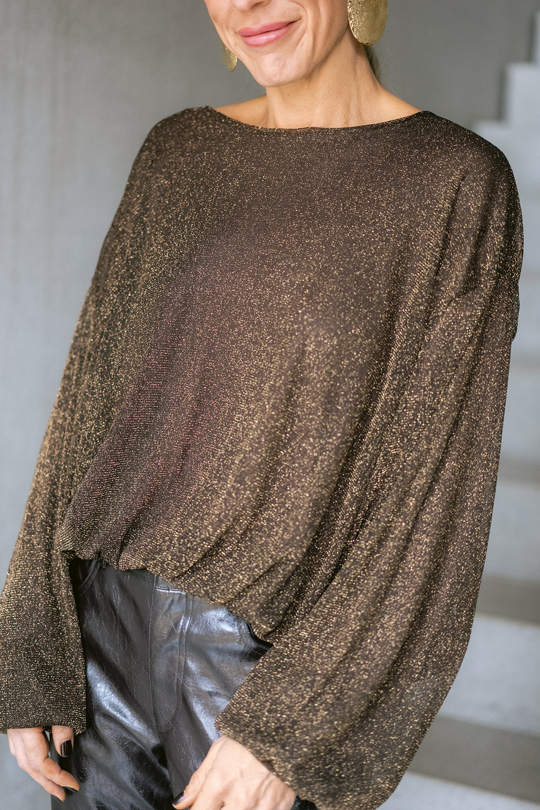 A shimmer blouse that’s equal parts effortless and glam. The round neckline and floaty long sleeves keep it soft and feminine, while the tucked waist detail adds a flattering shape.