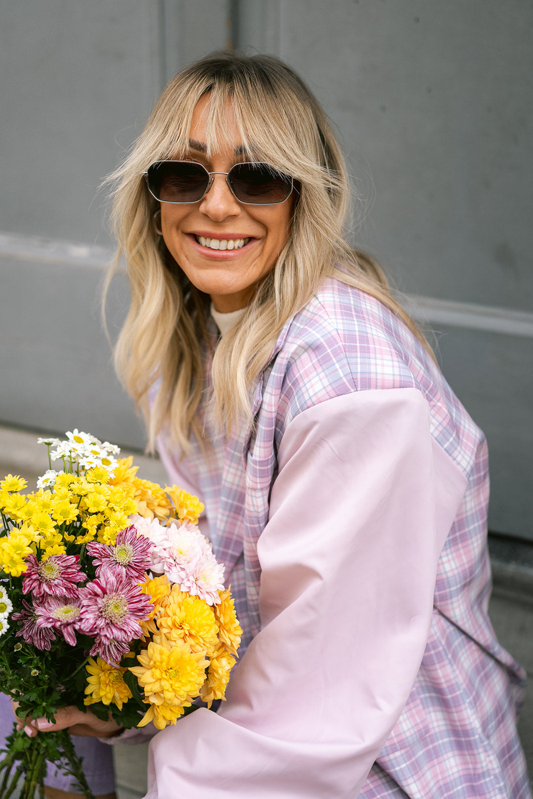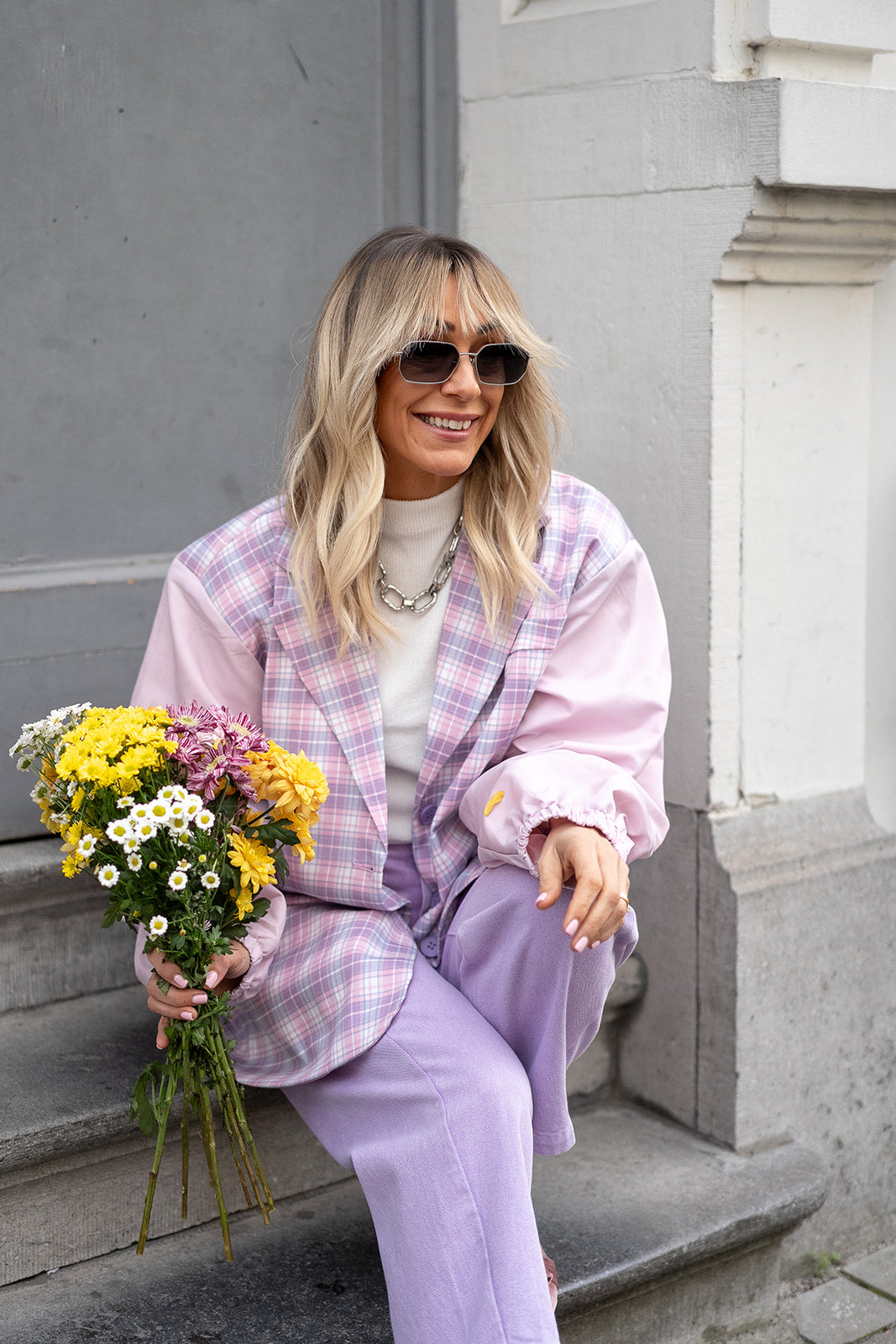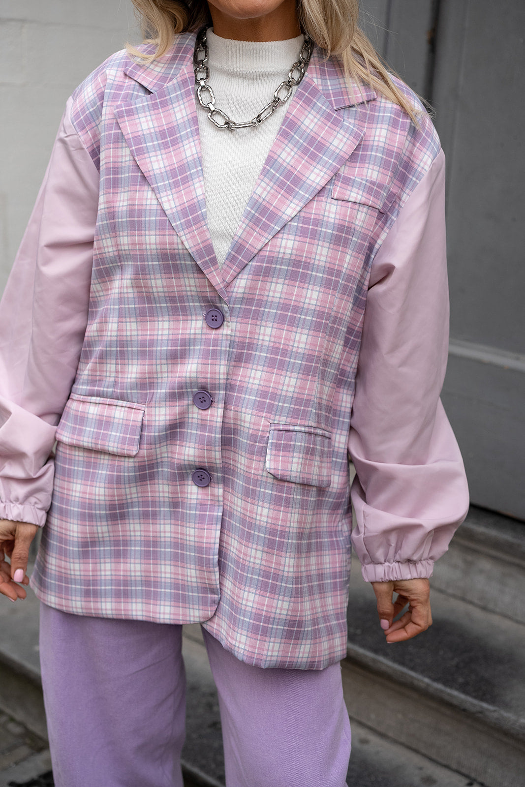 A sharp checkered blazer while the sleeves keep things cool in a solid color, finished with snug bomber-style cuffs at the wrists.