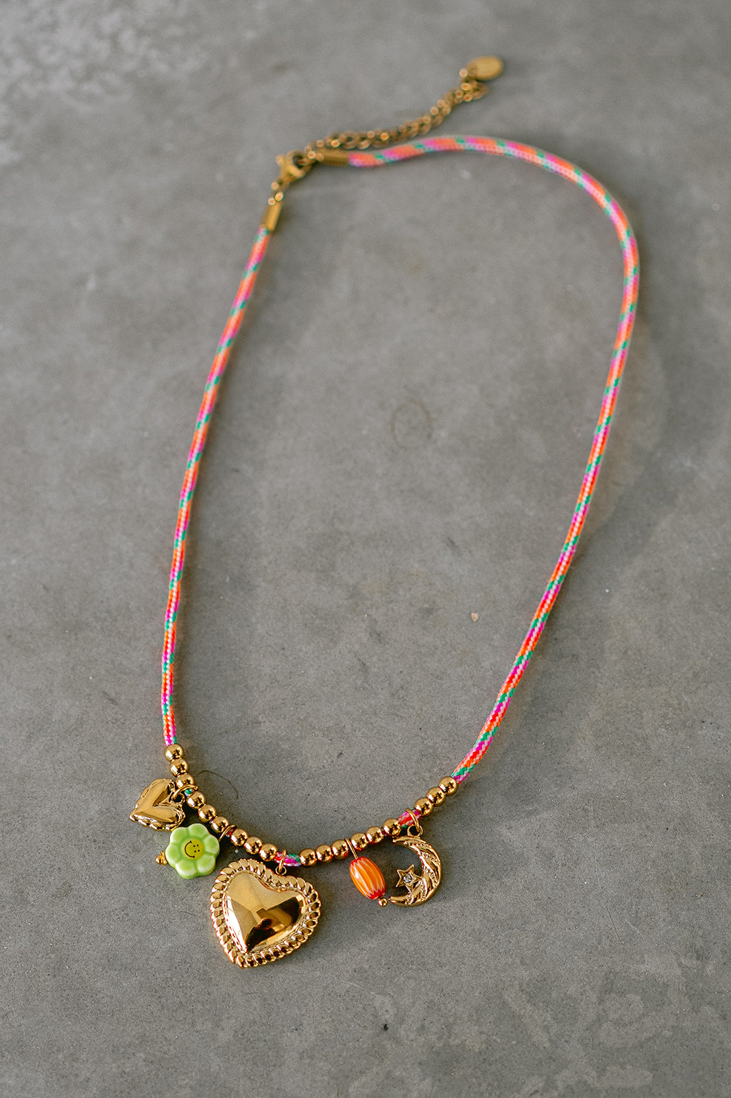 Brighten your day with this vibrant necklace that has a cheerful mix of golden, orange, and green charms that dance together in perfect harmony.