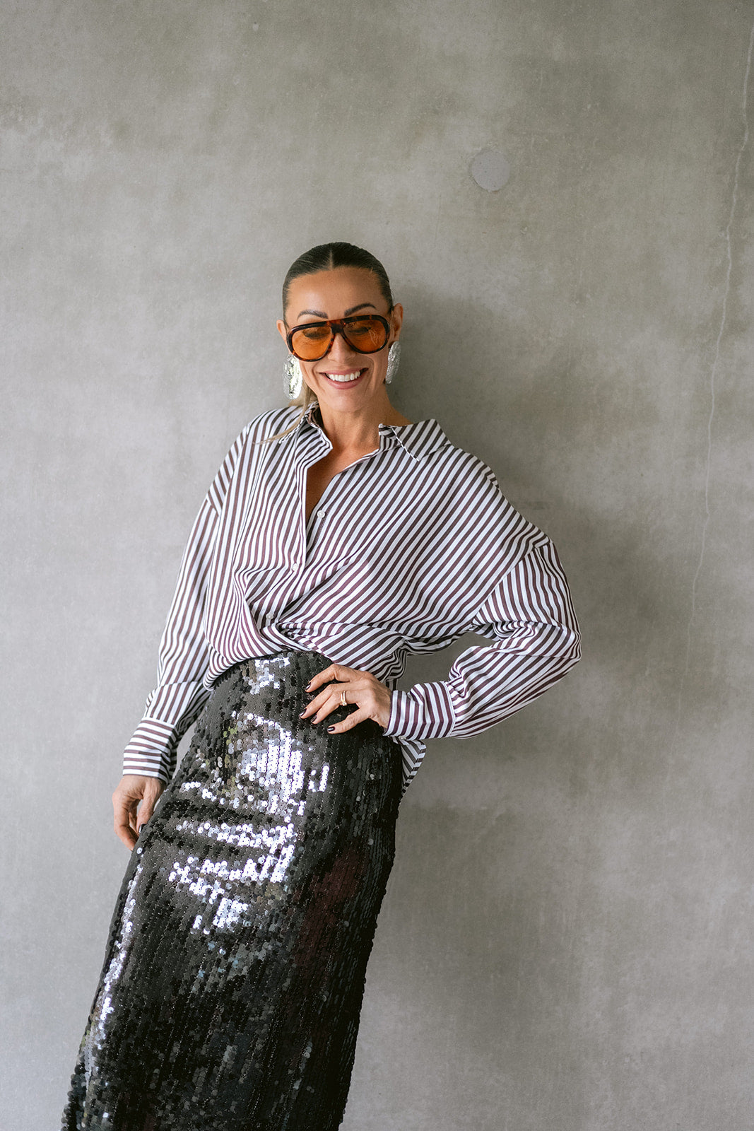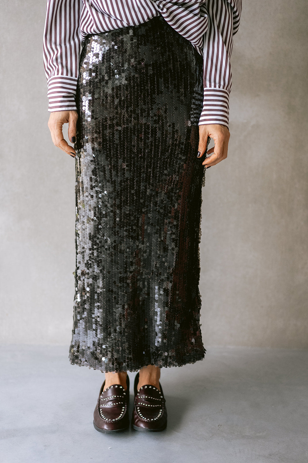 A lot drama, a lot of flair. The Cathy Skirt makes a bold statement. Designed in a straight silhouette and covered in sequins.