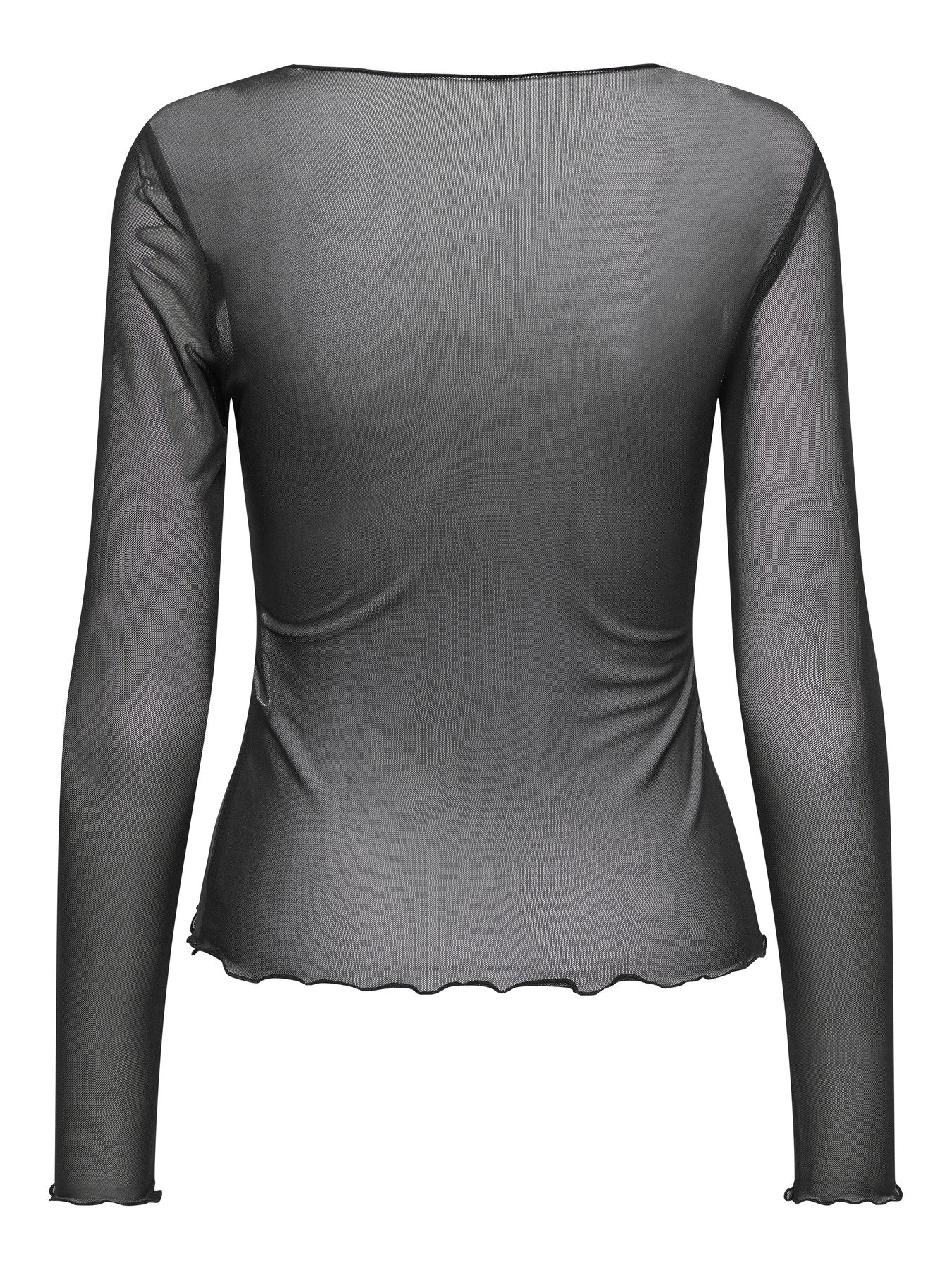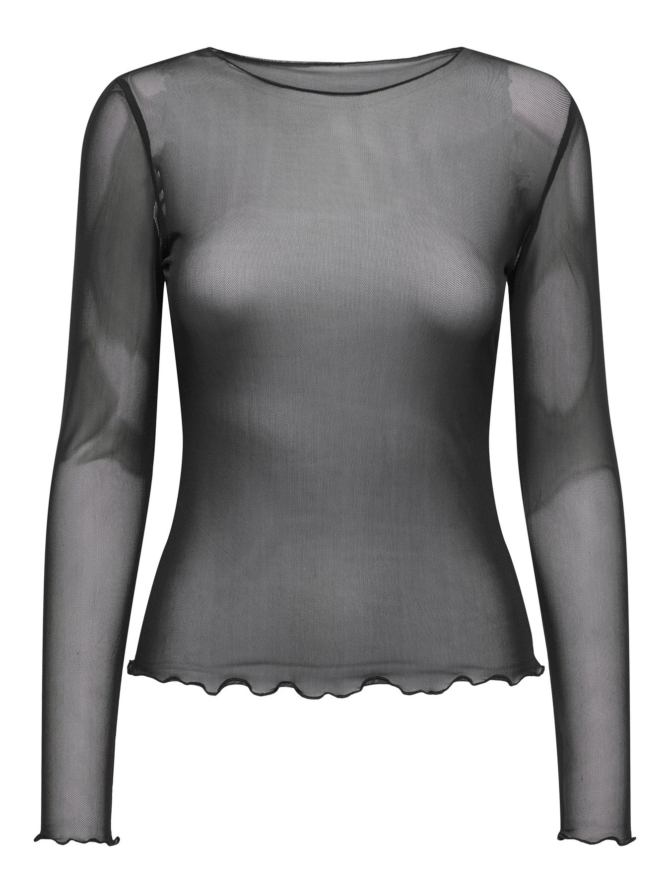 This sheer black T-shirt is your new go-to for after-dark layering. Designed with a wide boat neck and long sleeves, it’s sleek, sultry, and just a little undone. The lightweight, see-through fabric shows a hint of skin while keeping things elevated.