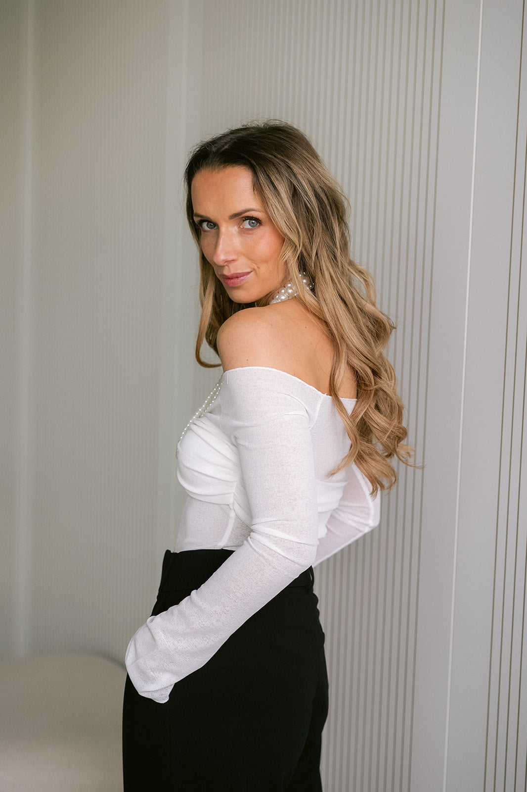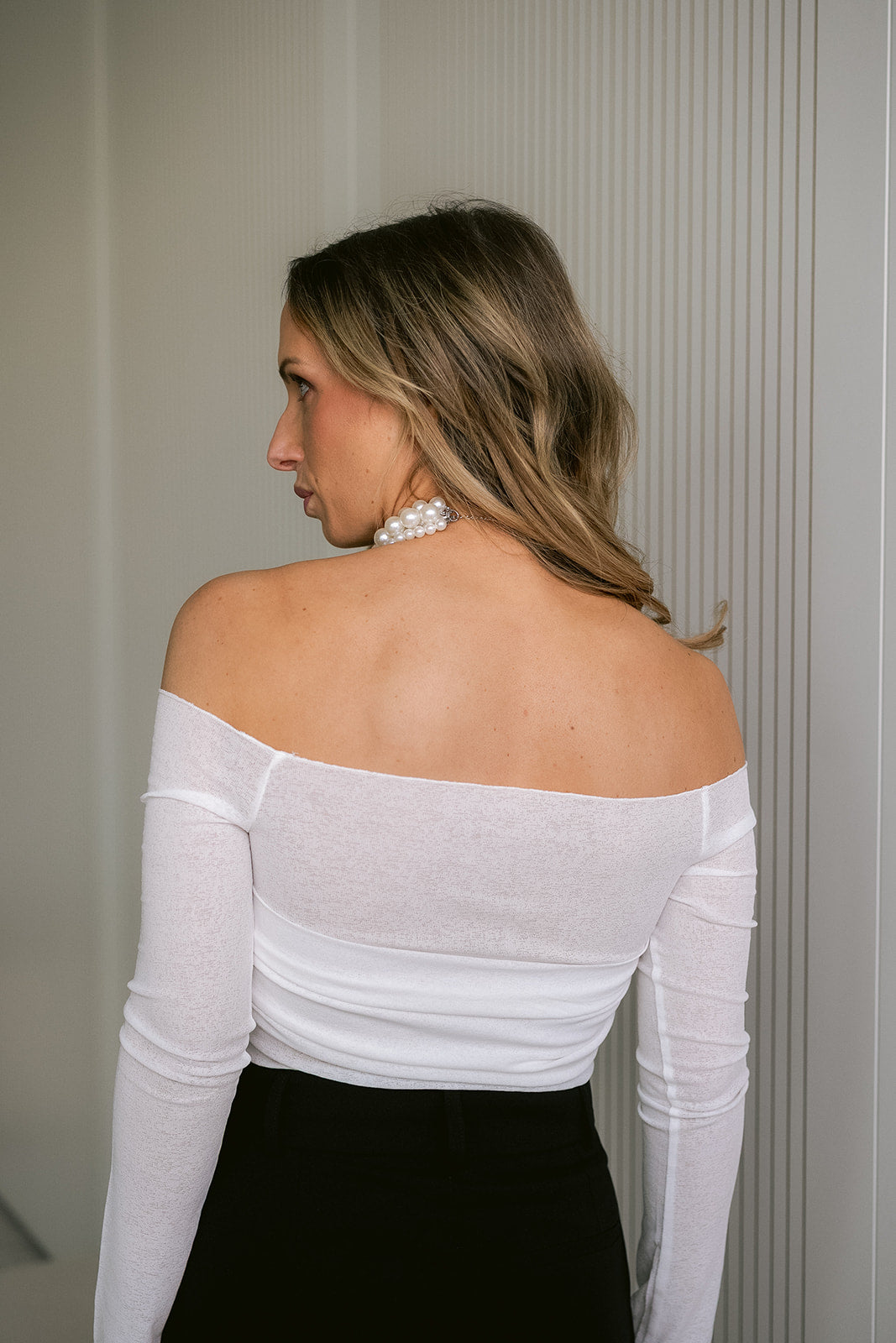An elegant off-shoulder silhouette with an gorgeous wrapped chest detail, this piece has long sleeves and an elongated cut.