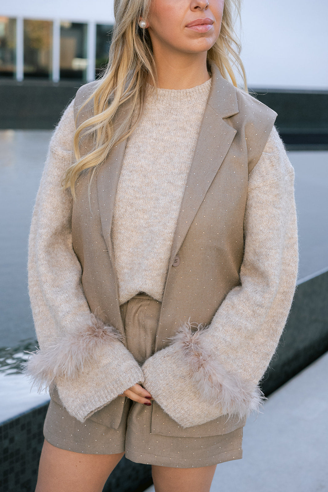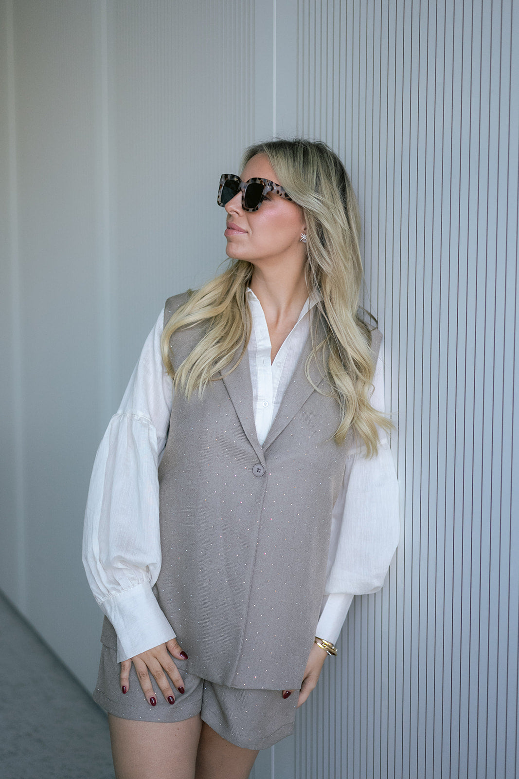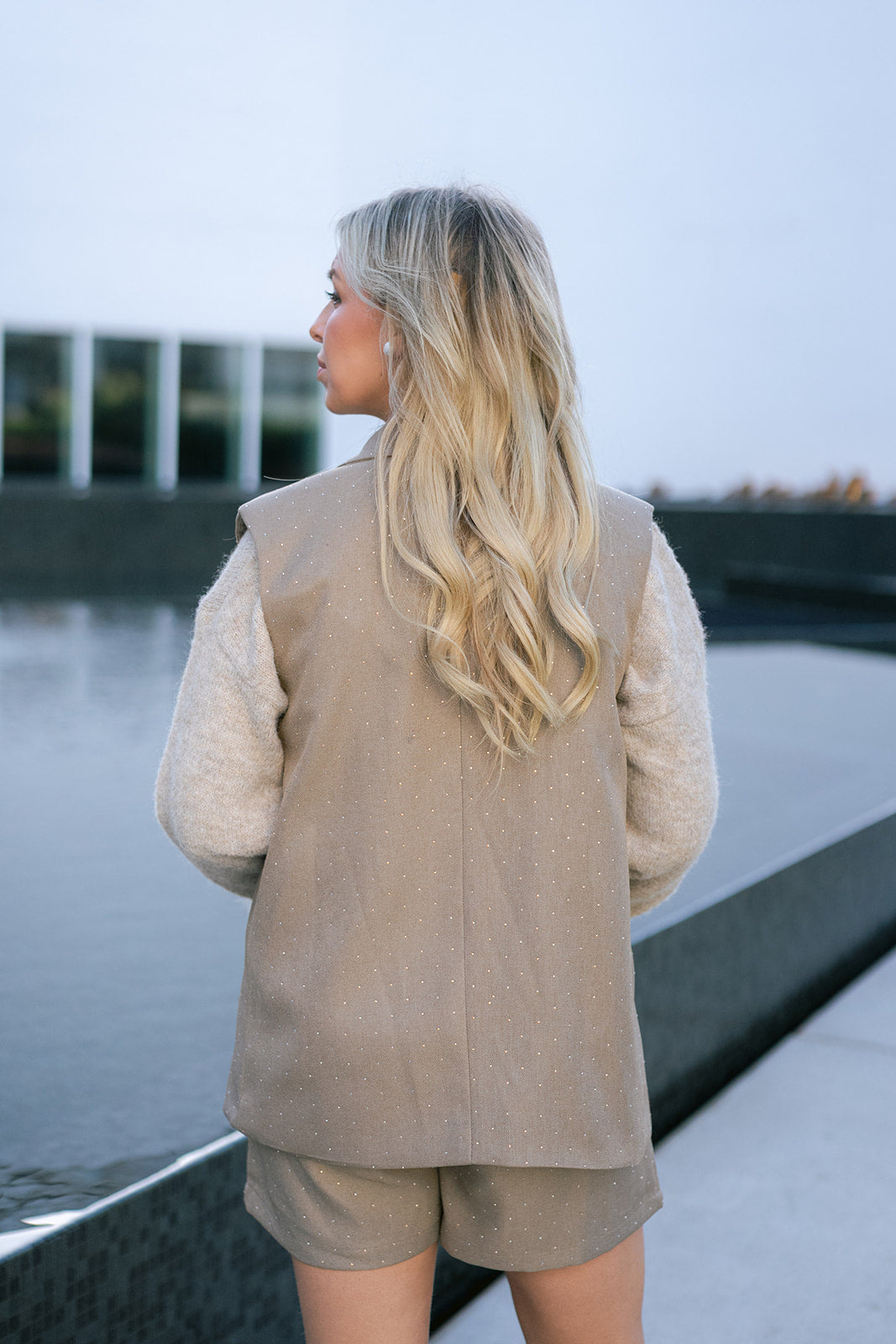 The sleeveless blazer brings all the boss energy with sharp lapels, a single button closure, and the prettiest hint of subtle strass that catches the light just right. The matching tailored shorts hit that sweet spot between structured and flirty.