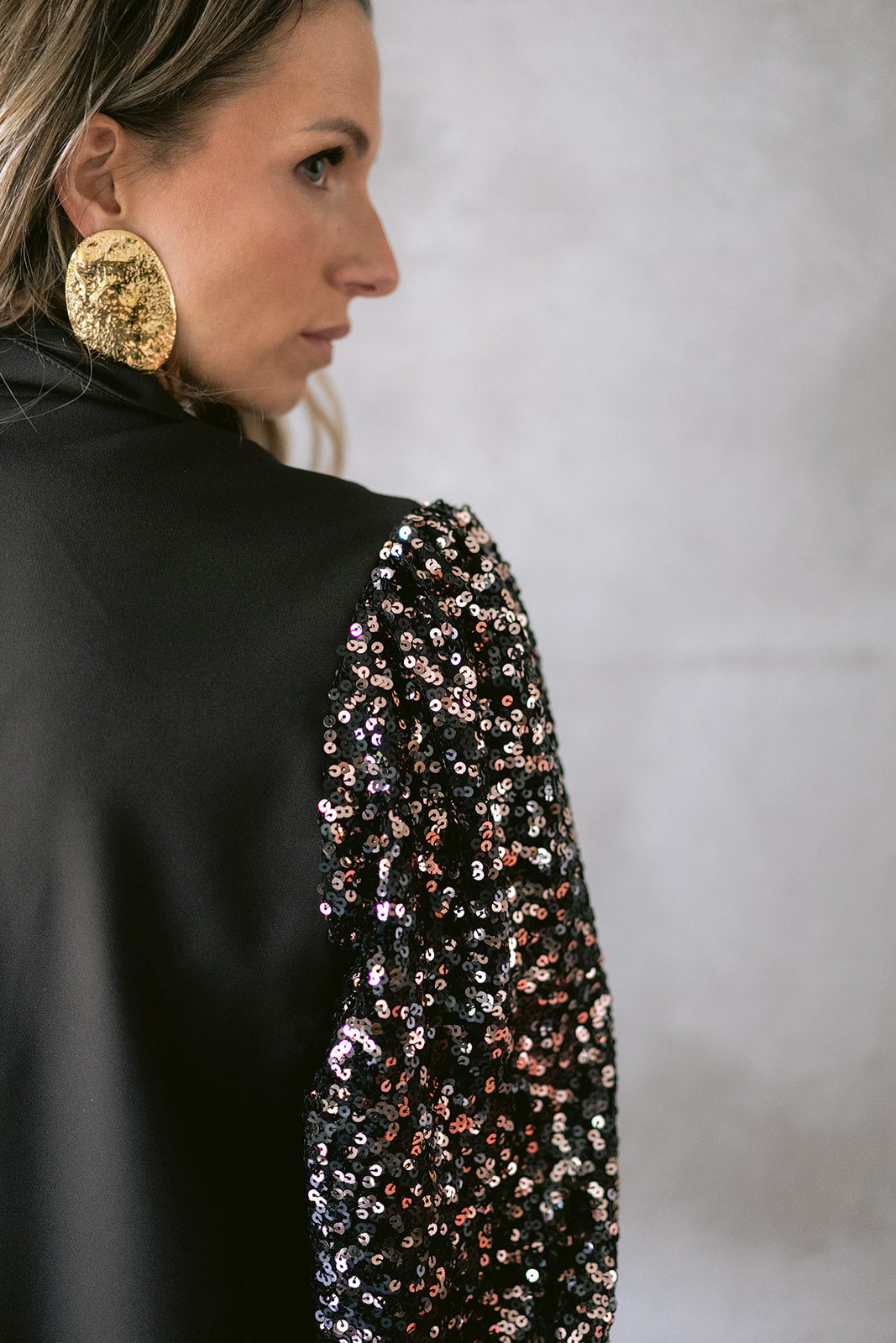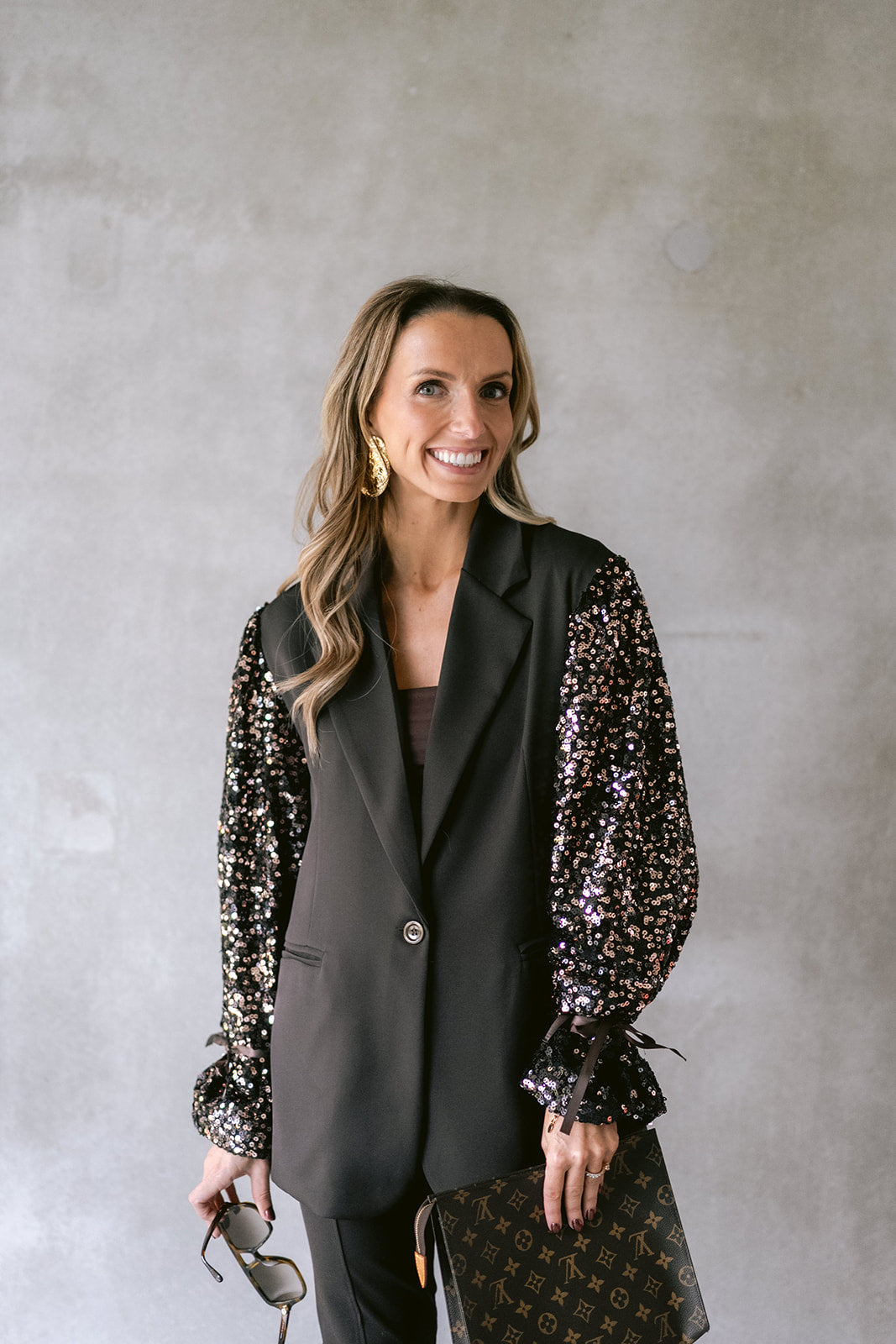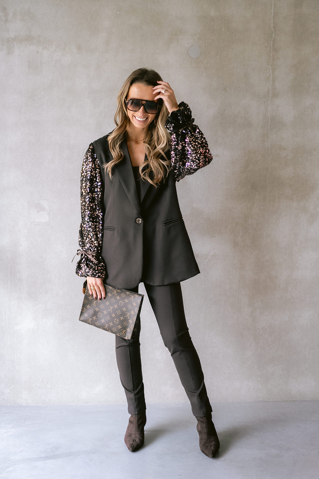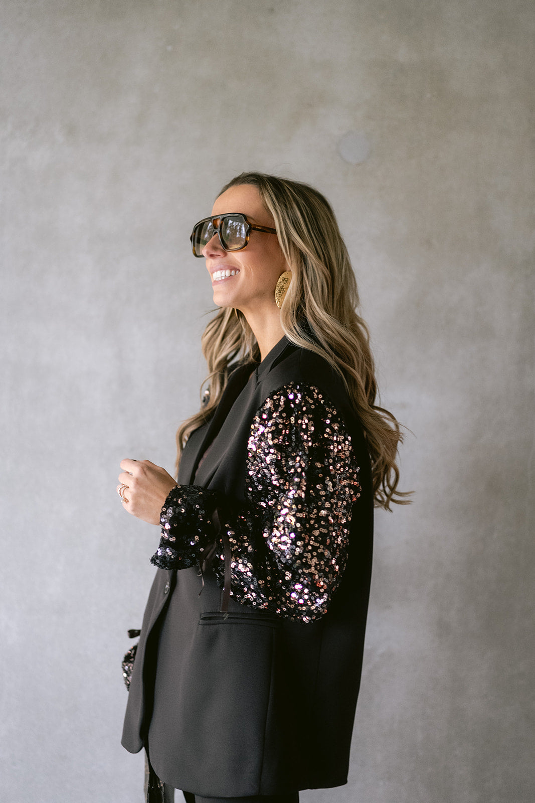 Meet the blazer that knows how to party. With shimmering sequin sleeves and a sleek tailored body, this piece adds instant sparkle to your festive ‘fits.