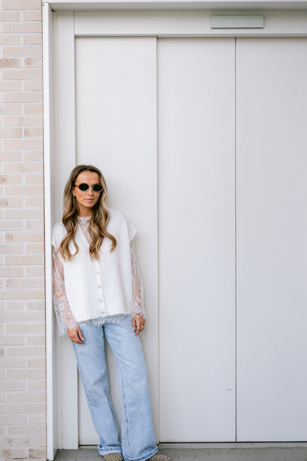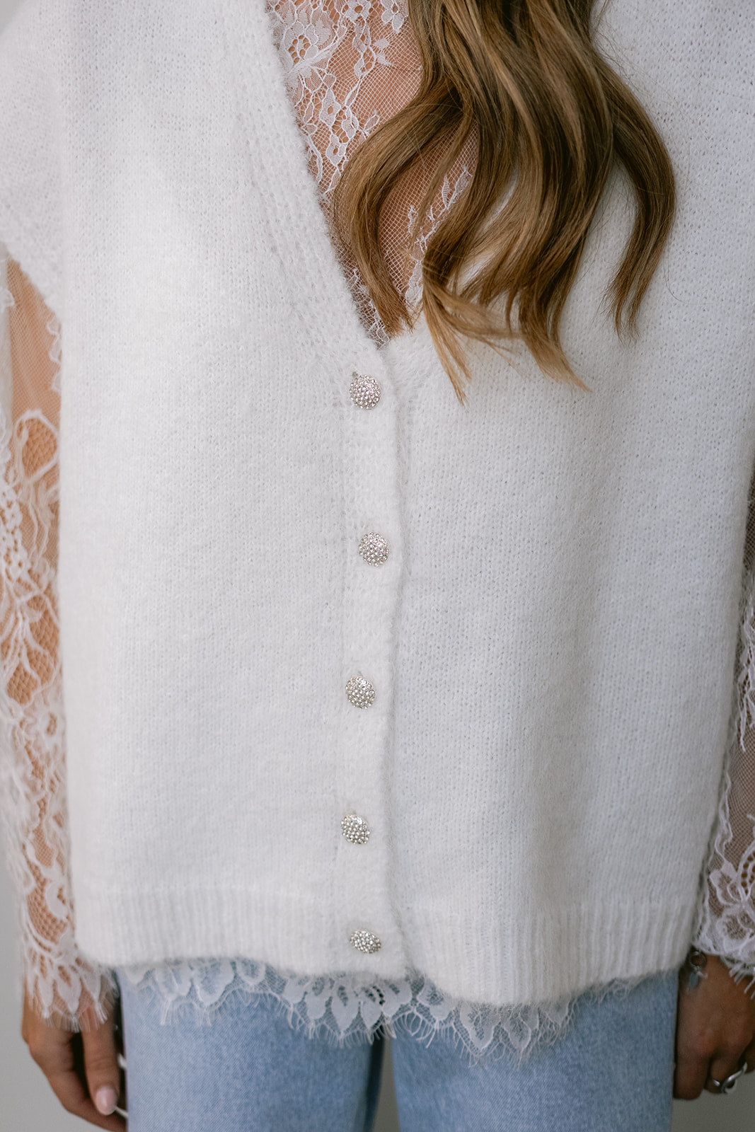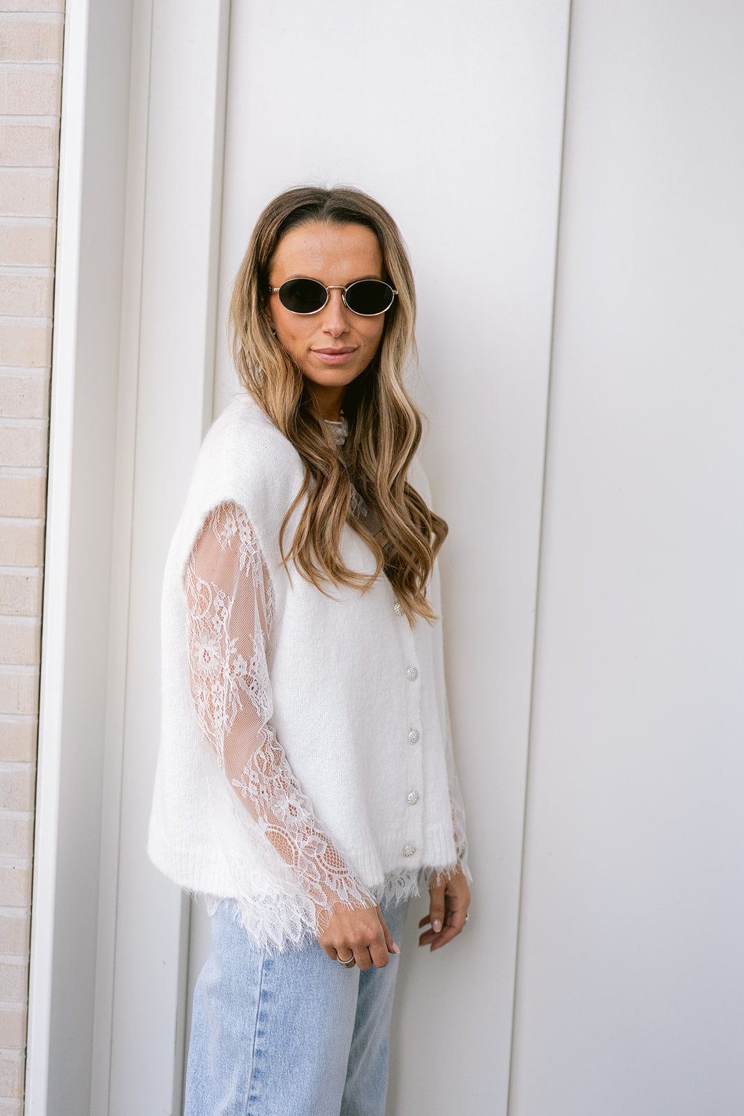 A cute knit cardigan with a touch of romance thanks to the lace trim. Layer over a dress or pair with your favorite jeans.