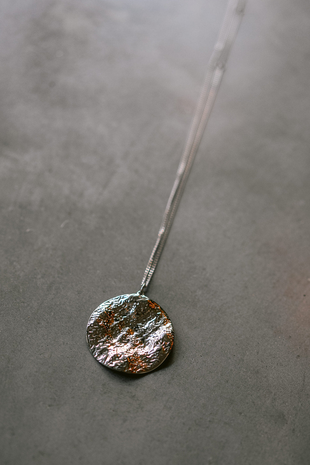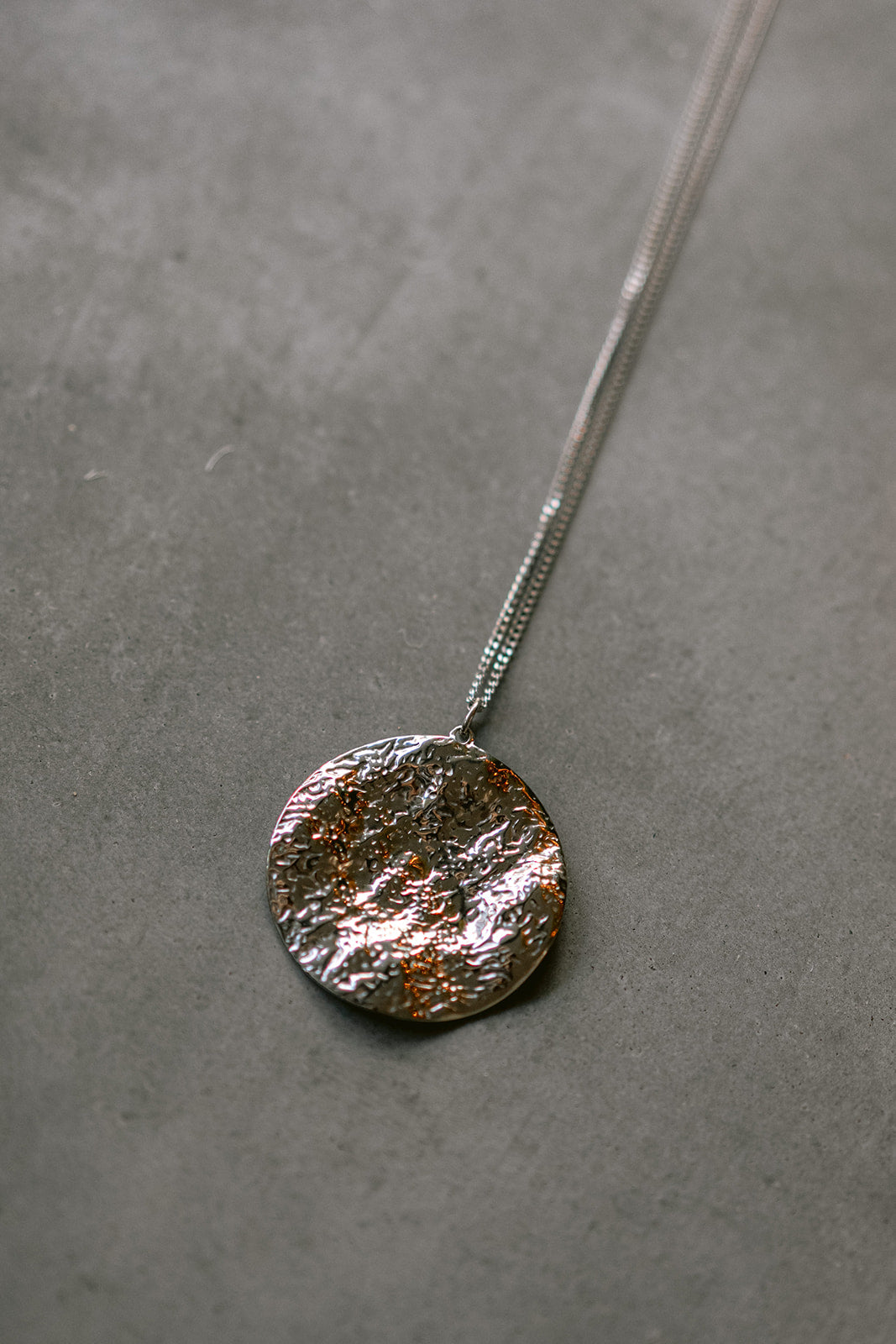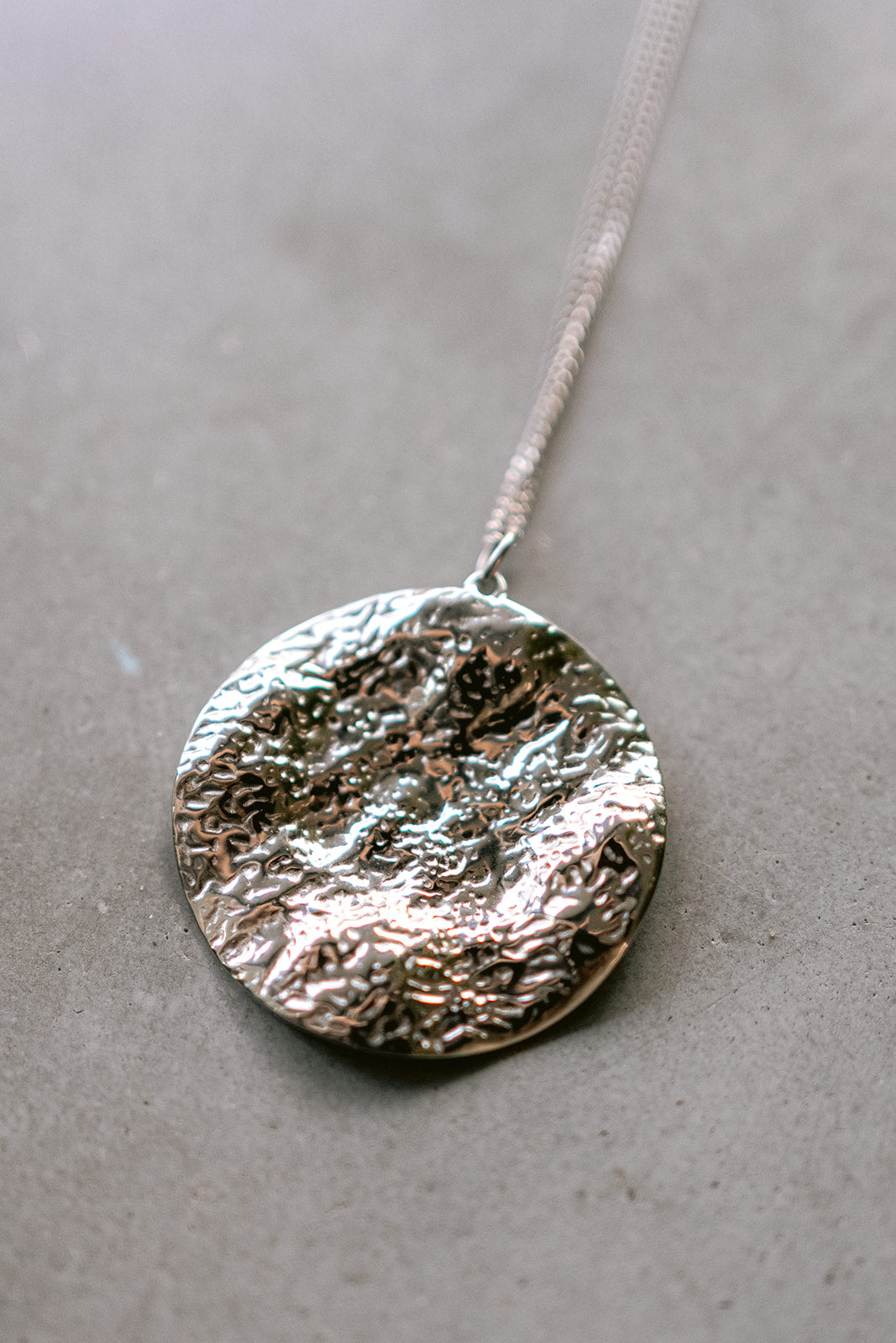 Add a touch of festive charm to your look with this refined necklace. The organically shaped round pendant shines with raw, molten texture. It’s simple, elegant, and full of quiet character, perfect for layering or letting it shine solo. Length: 50 cm + 10 cm extender.