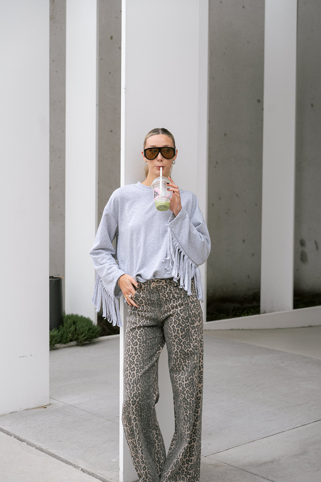 This oversized sweater is where cozy meets cool. A bold horizontal line of chunky fringe across the chest. Style it with straight jeans or a satin skirt for that effortless contrast.