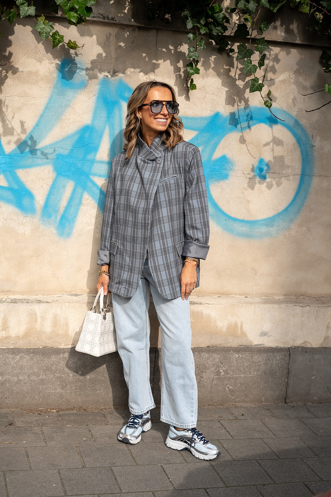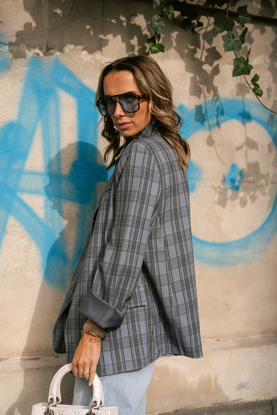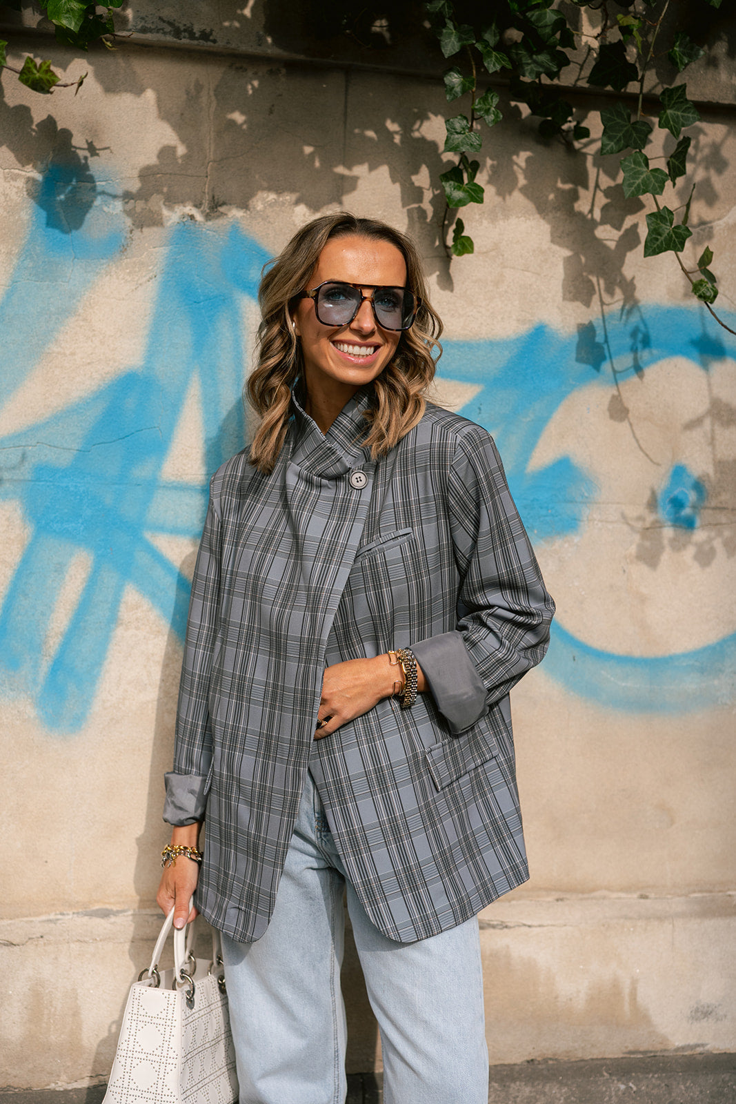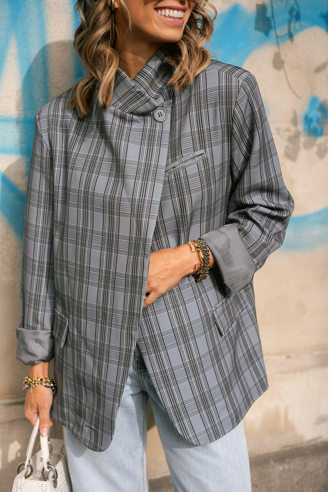 A-line checkered blazer that skims the hips. It has a modern single-button closure at the neckline for a streamlined silhouette.