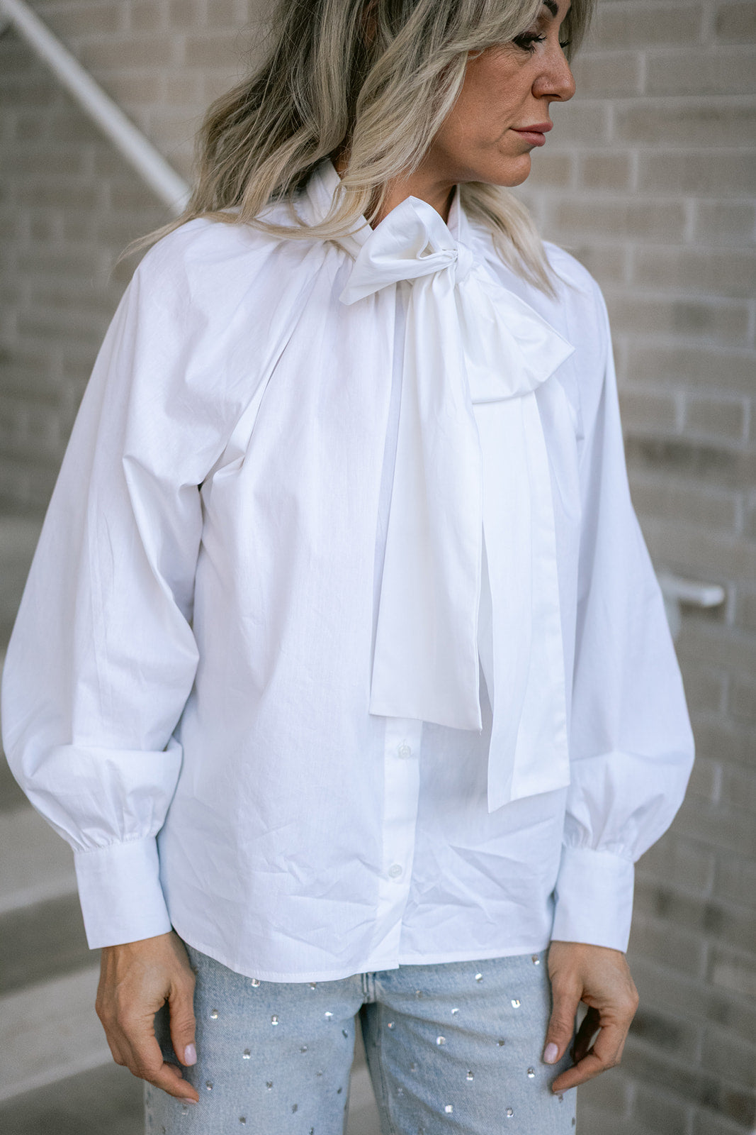 A classic crisp white shirt with a twist. It has the most charming bow on the neckline and a loose fit.