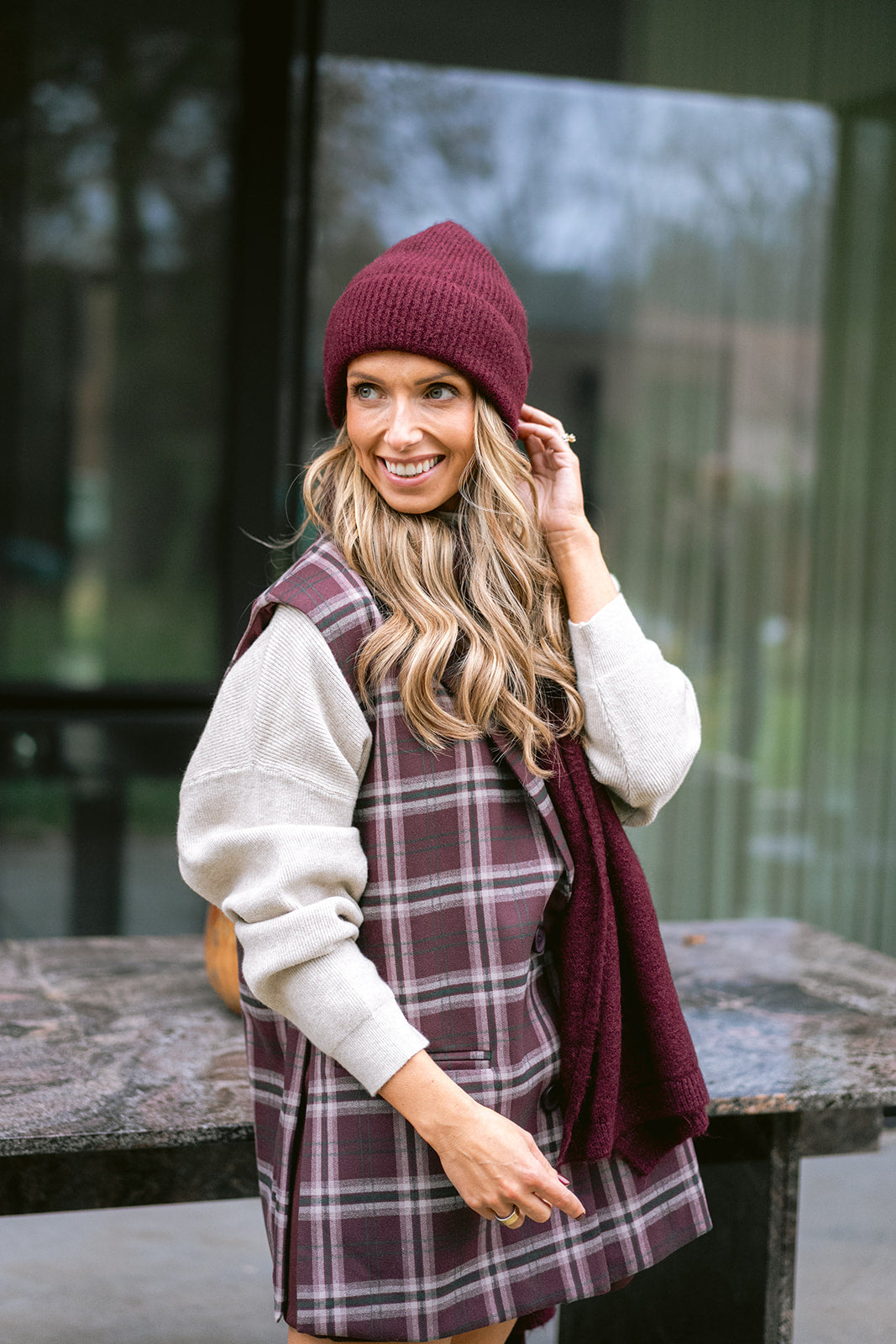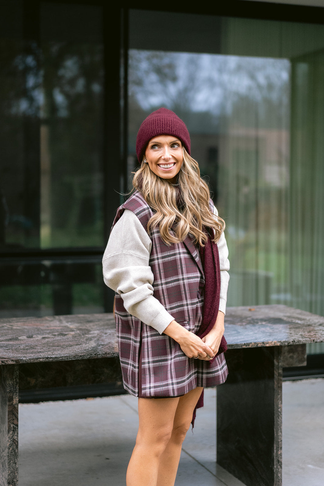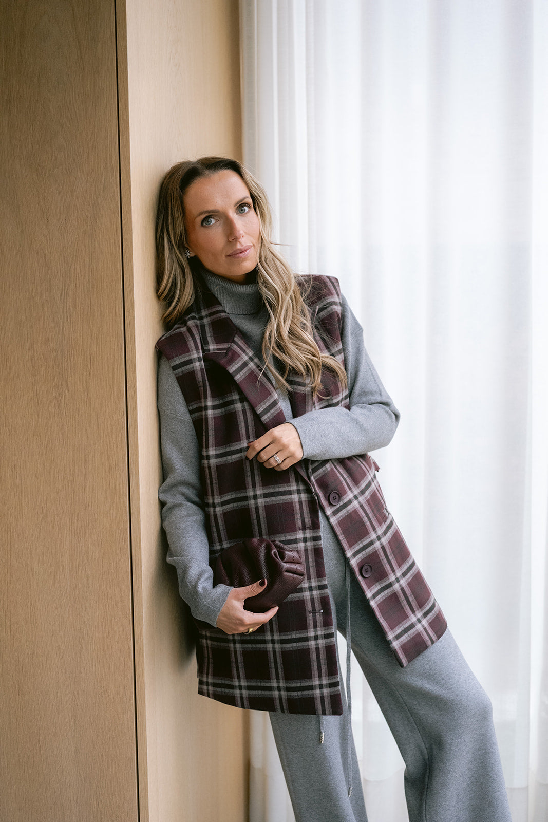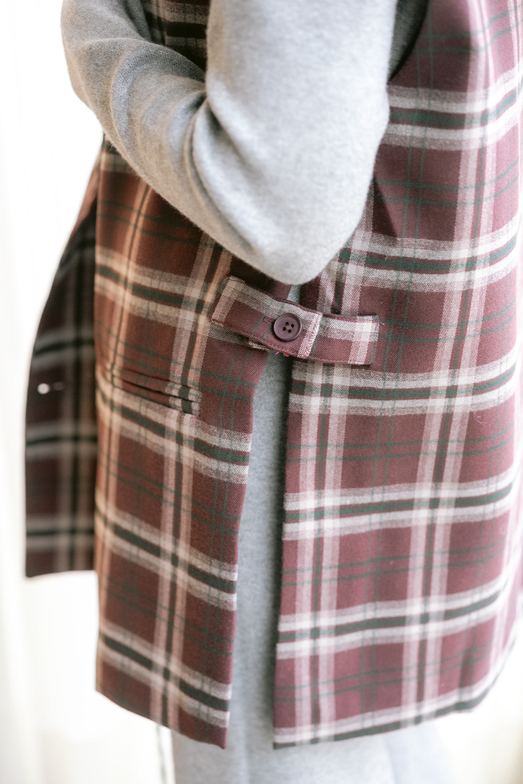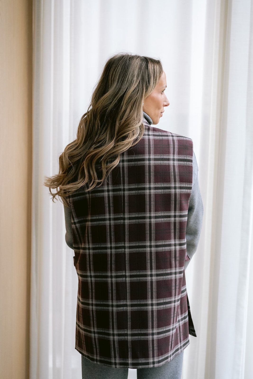 Tailored, timeless, and made to layer through the season. This sleeveless checkered blazer brings major style points with its sharp lines and structured fit. The bold check pattern adds that winter-approved flair, while the sleeveless cut keeps it fresh and modern. It’s giving classic with a cool twist.