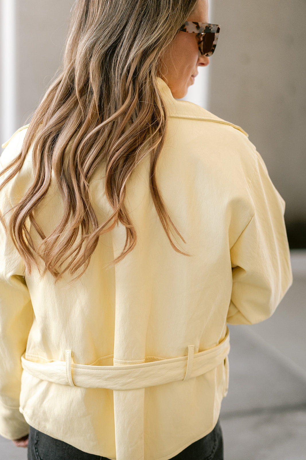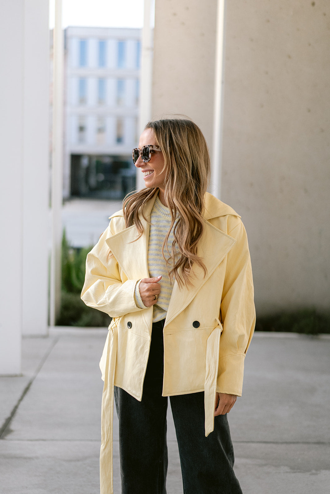 Meet the Sandra jacket. This cheerful trench features a cinched waist tie that flatters your silhouette, with classic long sleeves. Perfect for layering over anything.