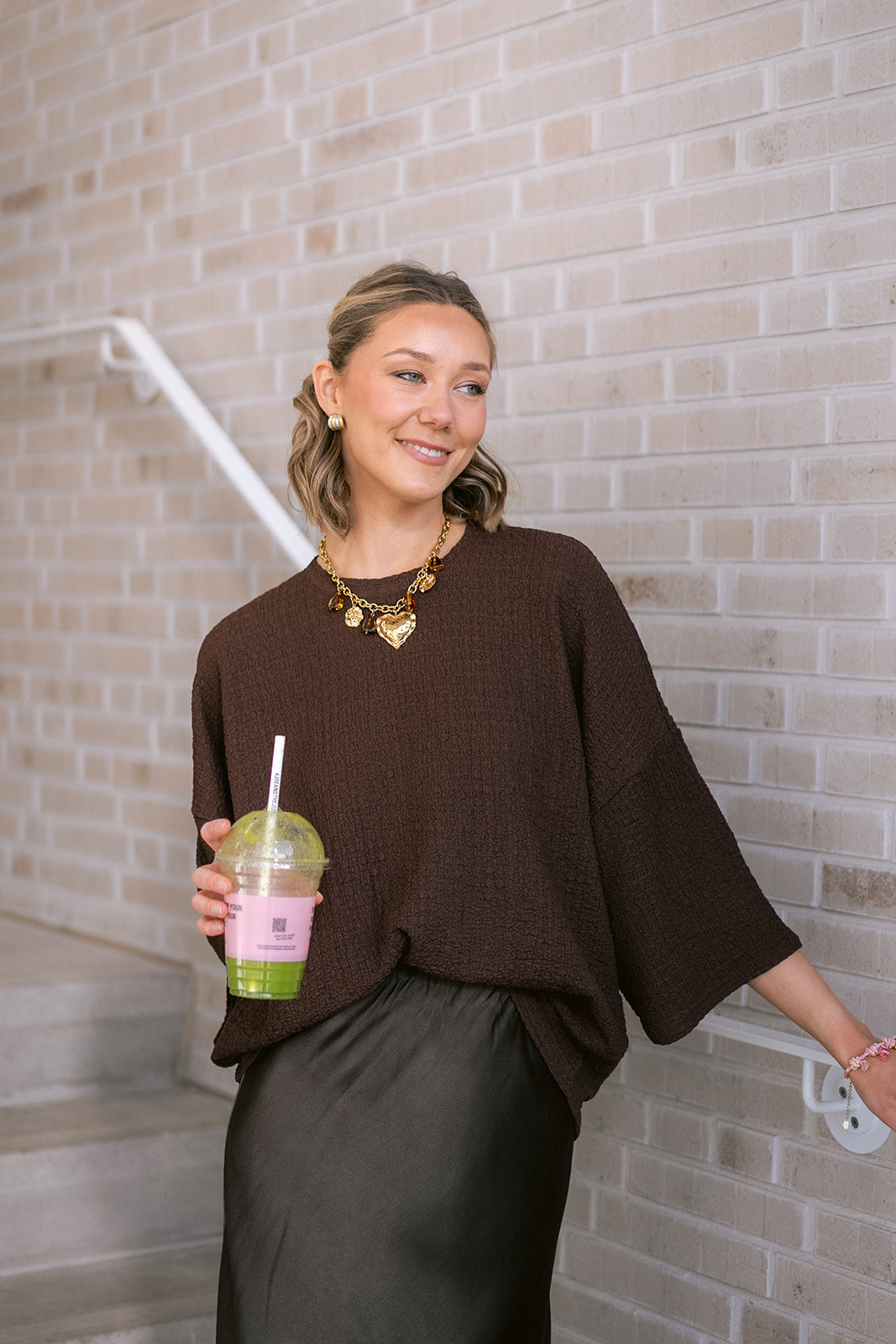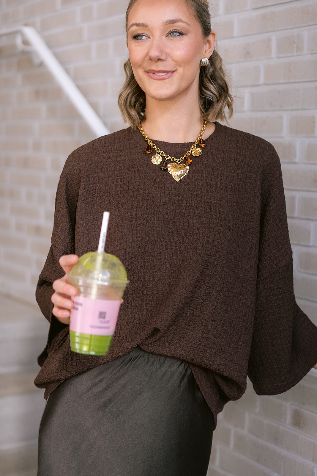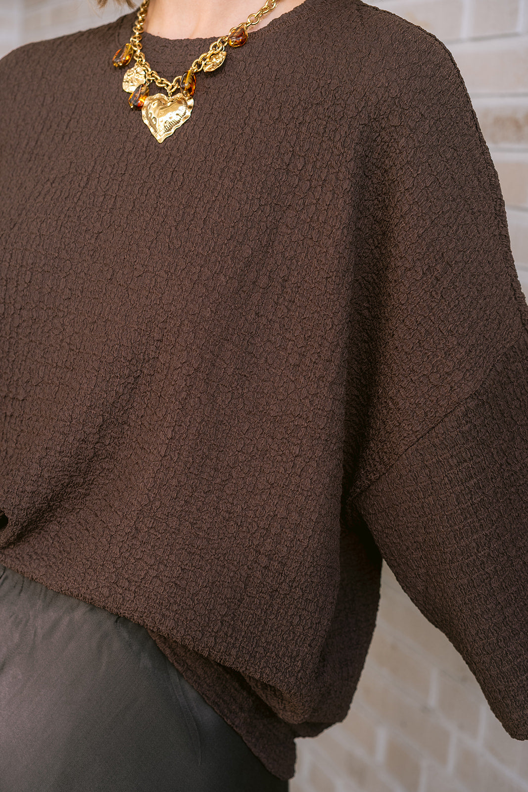 Effortless style with this oversized brown t-shirt, designed with relaxed elbow-length sleeves and a classic round neckline. Perfect for creating that coveted laid-back look, this versatile piece transitions seamlessly from casual weekends to relaxed workdays.