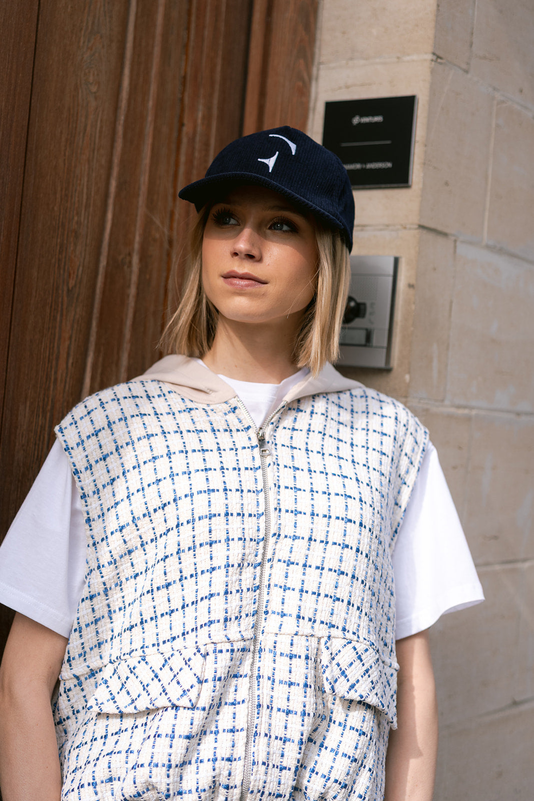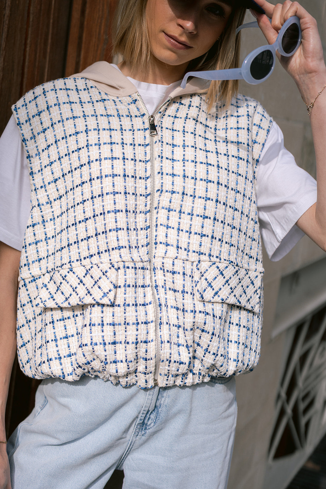 Throw on this checkered gilet blazer for instant edge, complete with a cozy hoodie and smooth zipper closure. Perfect for layering over your favorite tee or dress, it's the effortless piece that takes any outfit from basic to bold.