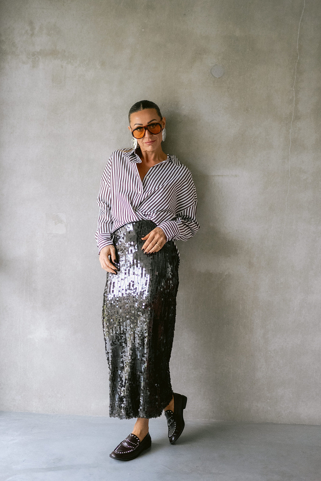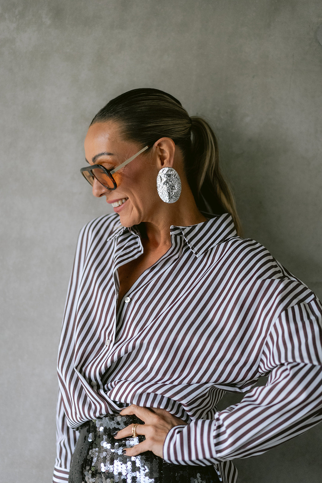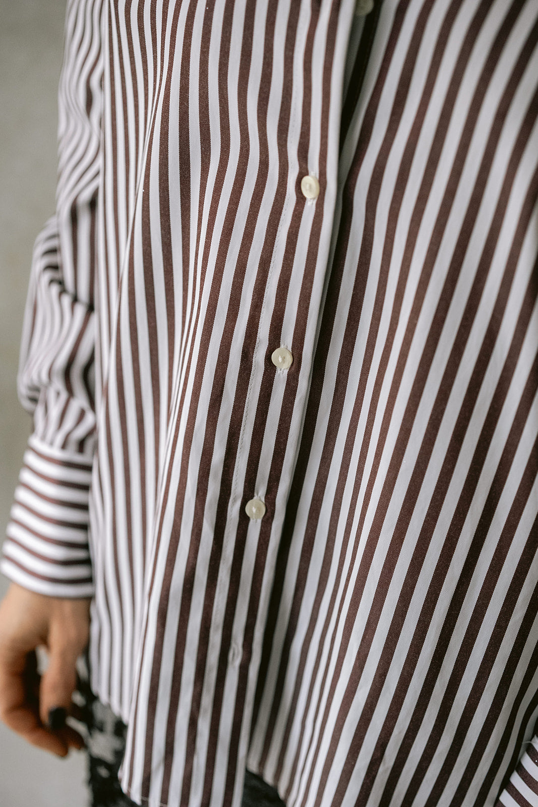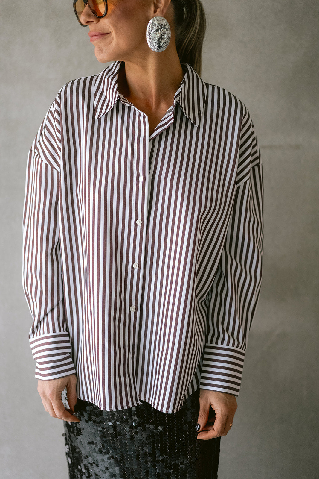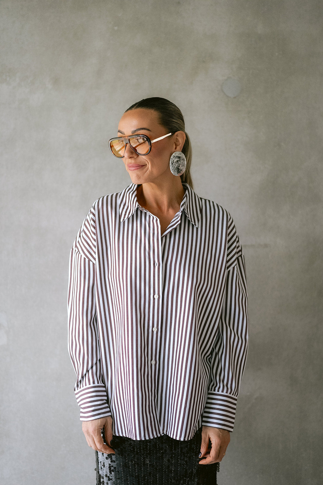 The Vesper Shirt brings that ‘borrowed-from-him, styled-by-you’ energy. Oversized fit with a classic collar and button-down front, finished in a silky pink-burgundy tone striped pattern that feels a little flirty. Tuck it into trousers or wear loose over a tank and denim.
