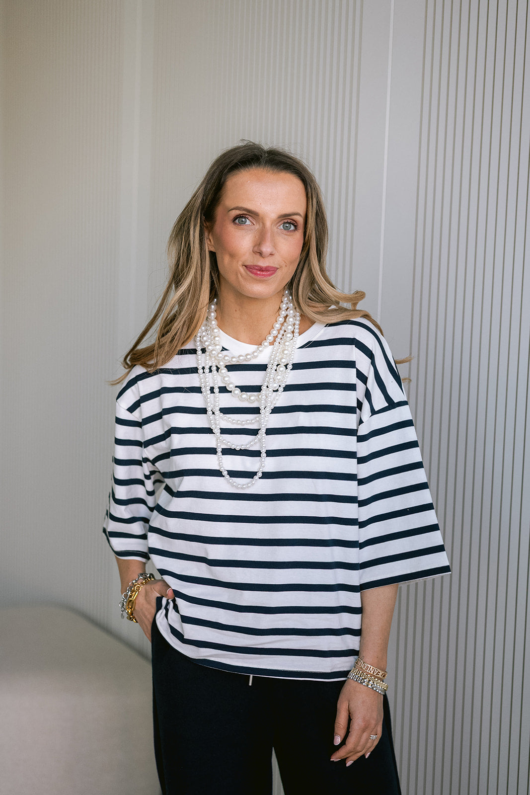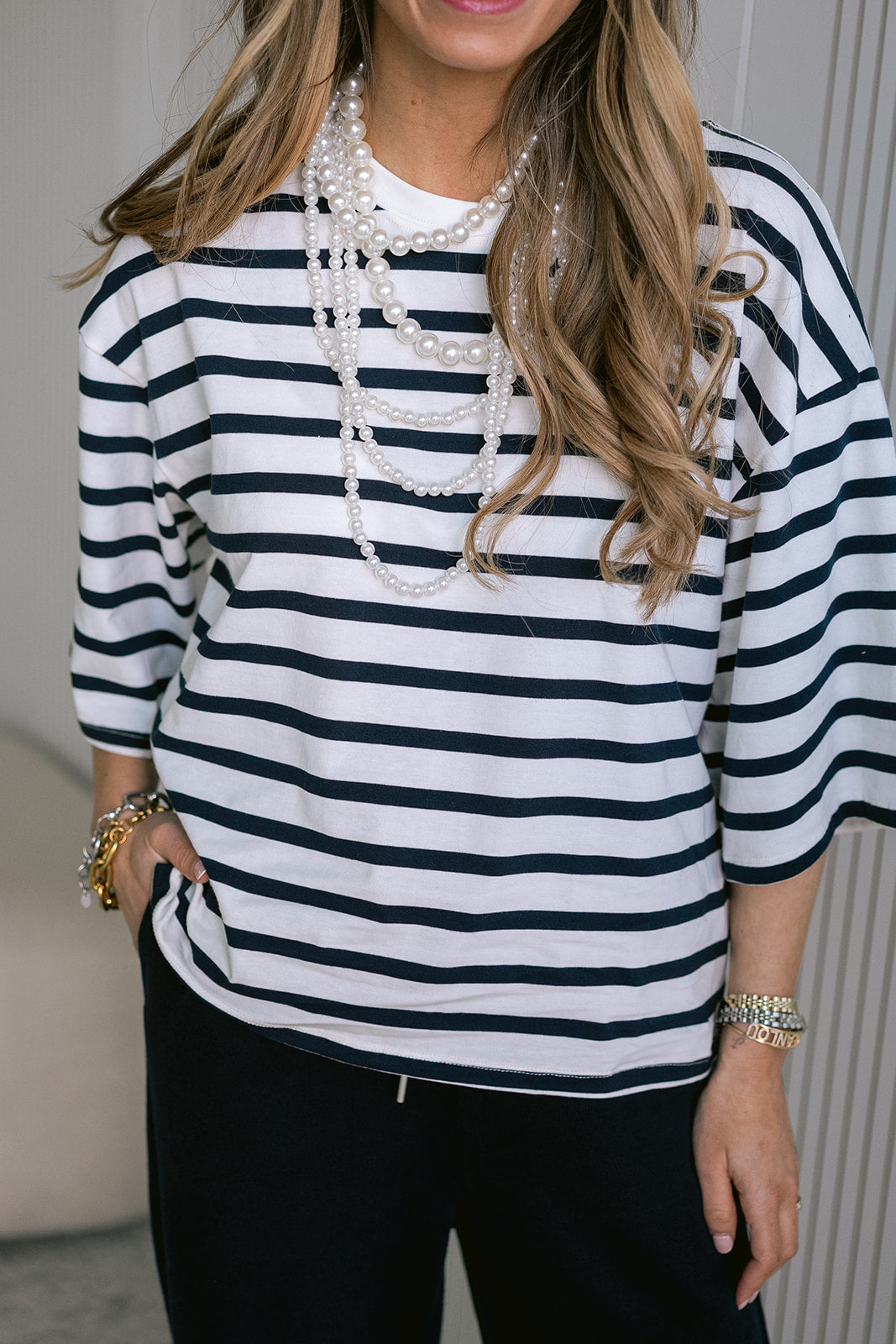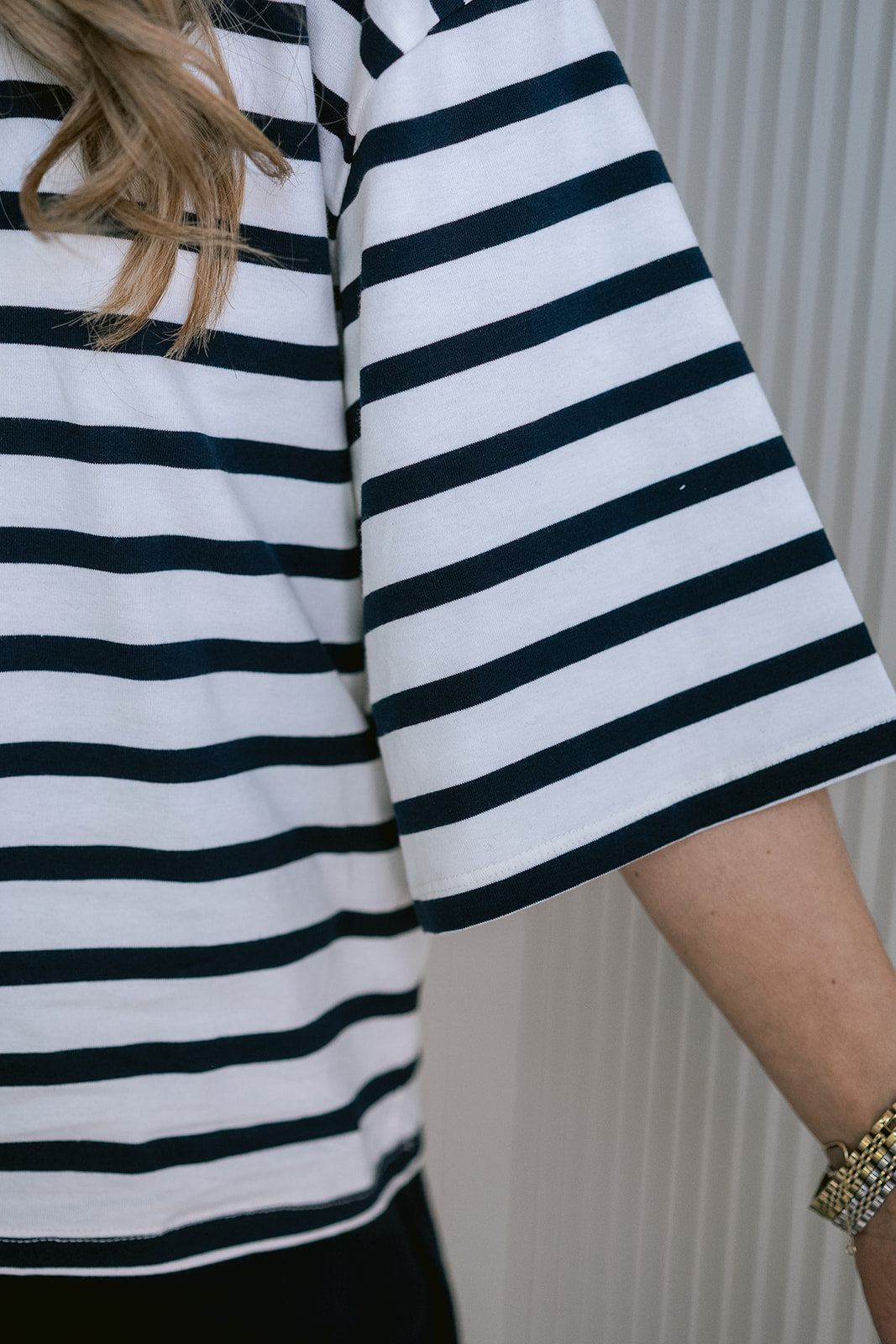 Effortless oversized t-shirt, with bold black and white stripes that make a statement. The relaxed fit and short sleeves offer all-day comfort, while the classic round neckline keeps the look timeless and versatile.